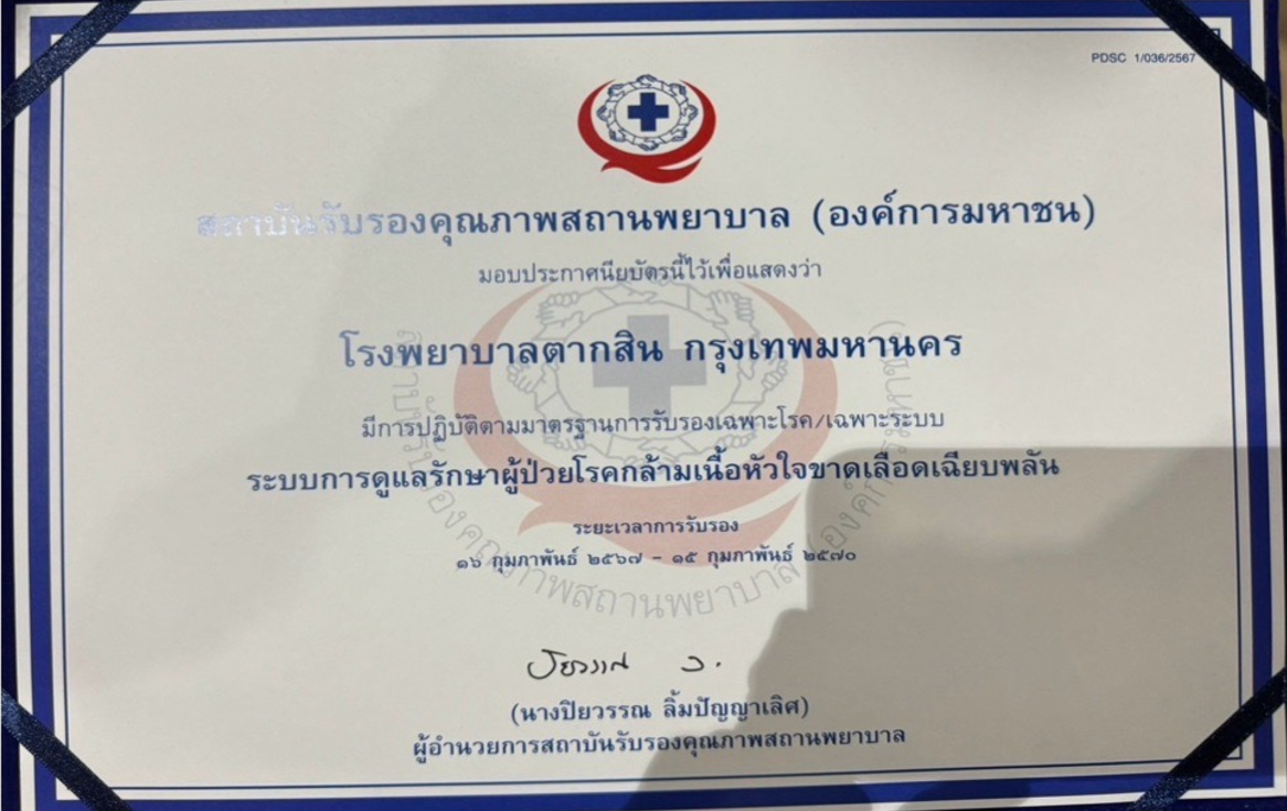 ![]() | 5 | ได้รับการตรวจประเมินรับรองกระบวนการคุณภาพตามมาตรฐานเฉพาะโรค/เฉพาะระบบ โรคหัวใจ จากสถานคุณภาพสถาบันพยาบาล (องค์กรมหาชน)- | 30.00 | 2023-12-01 00:00:00.0000000 | 2024-03-30 00:00:00.0000000 |