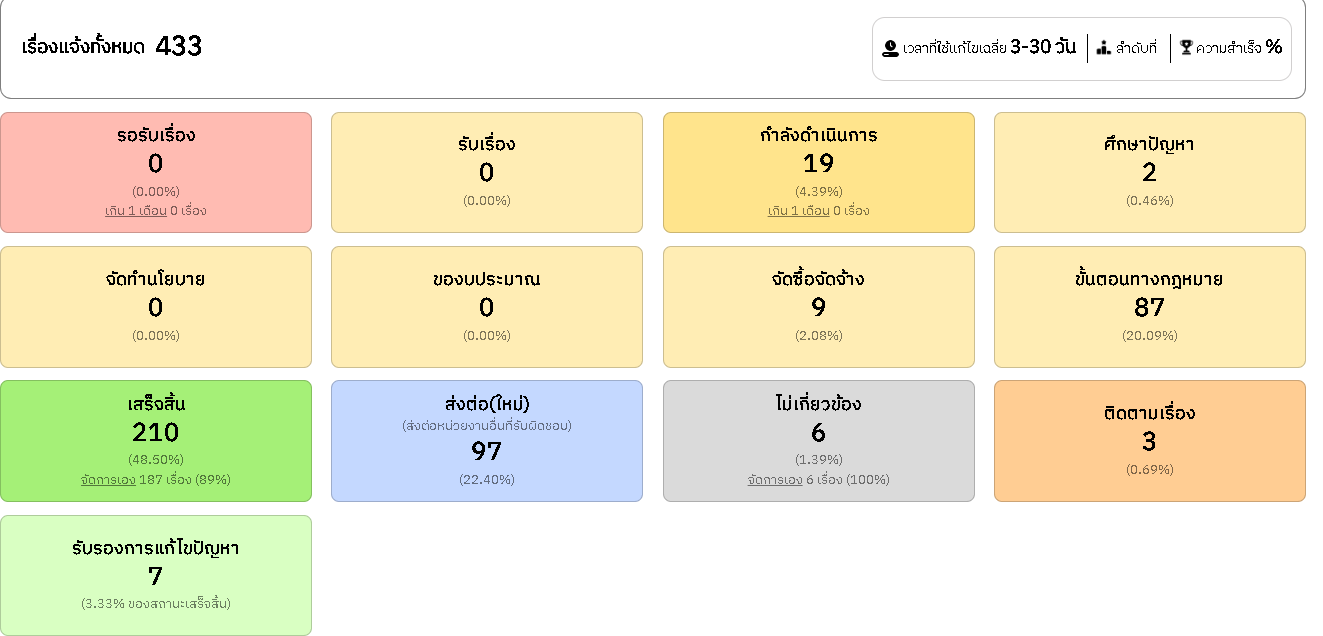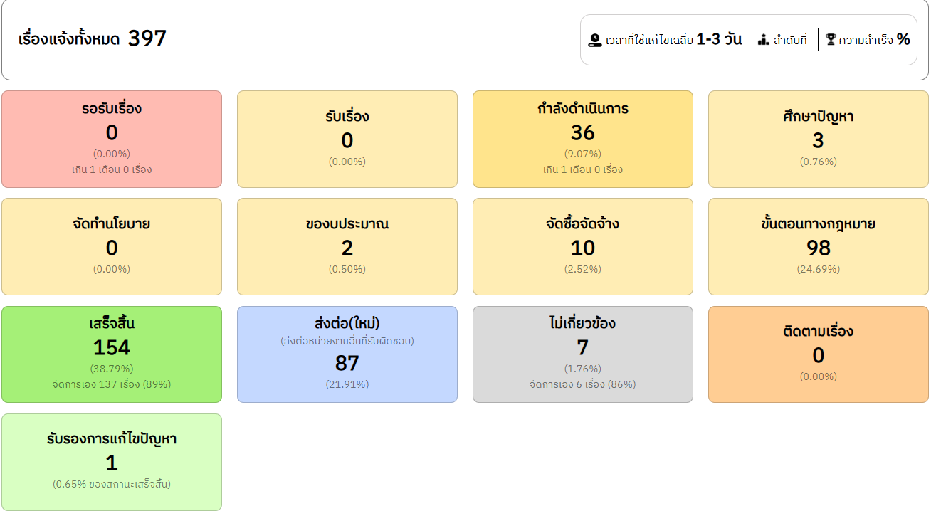 | 102 |  | 2024-10-03 00:00:00.0000000 | 75.00 | 0.00 |  | ความสำเร็จในการแก้ไขปัญหาข้อร้องเรียนของประชาชนผ่าน Traffy Fondue ประจำเดือนกันยายน 2567 | |