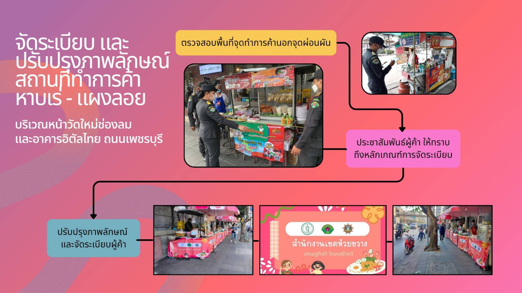 | 7 | ![]() | 2023-12-30 00:00:00.0000000 | 0.00 | 0.00 | เดือนธันวาคม 2566 จัดเจ้าหน้าที่สายตรวจดำเนินการกวดขันและประชาสัมพันธ์ พร้อมทั้งแจกประกาศผู้ค้าที่ทำการค้านอกจุดผ่อนผันให้ทำการยกเลิกทำการค้า และแนะนำให้ผู้ค้าย้ายไปทำการค้าในจุดรองรับ | ||