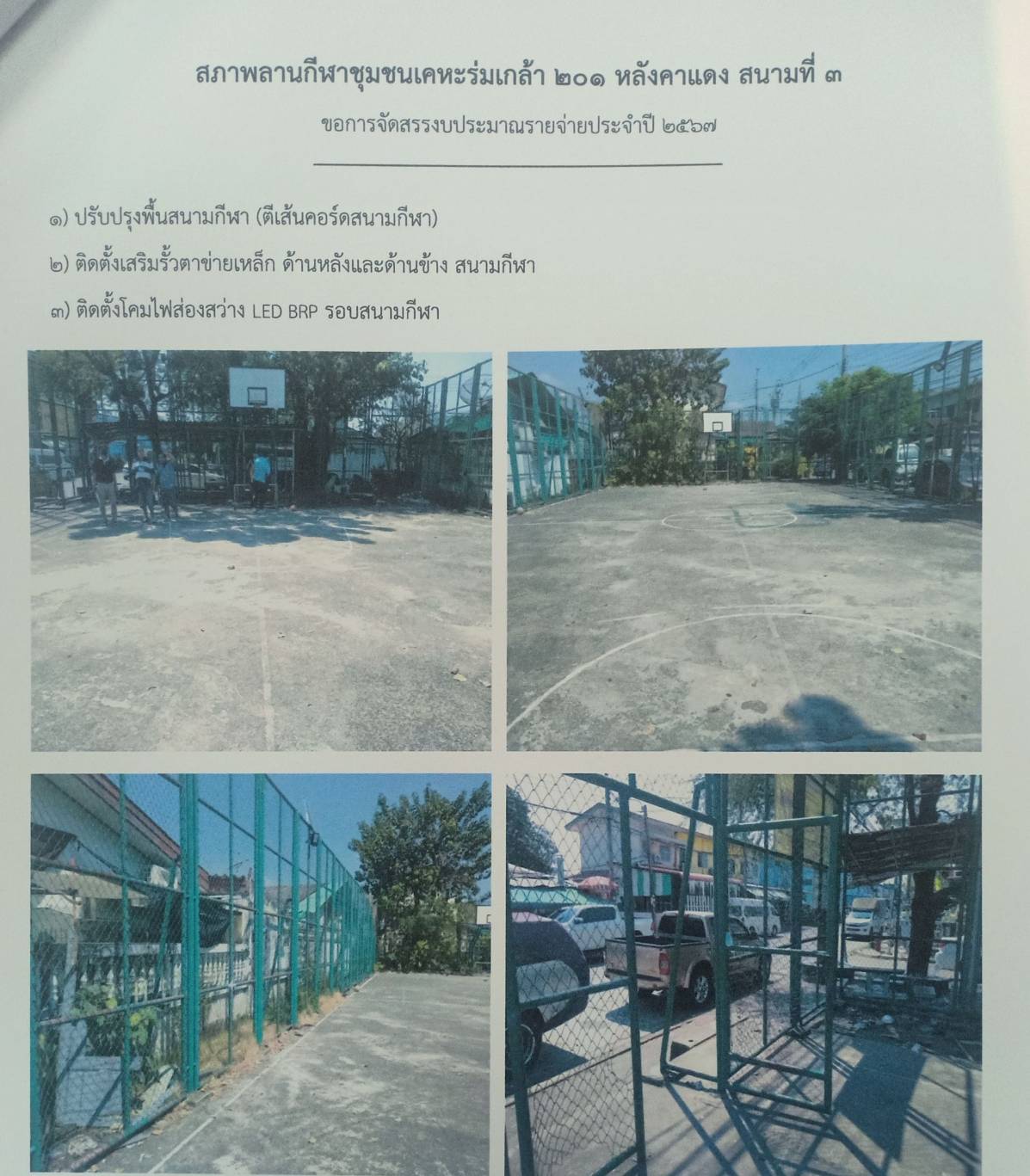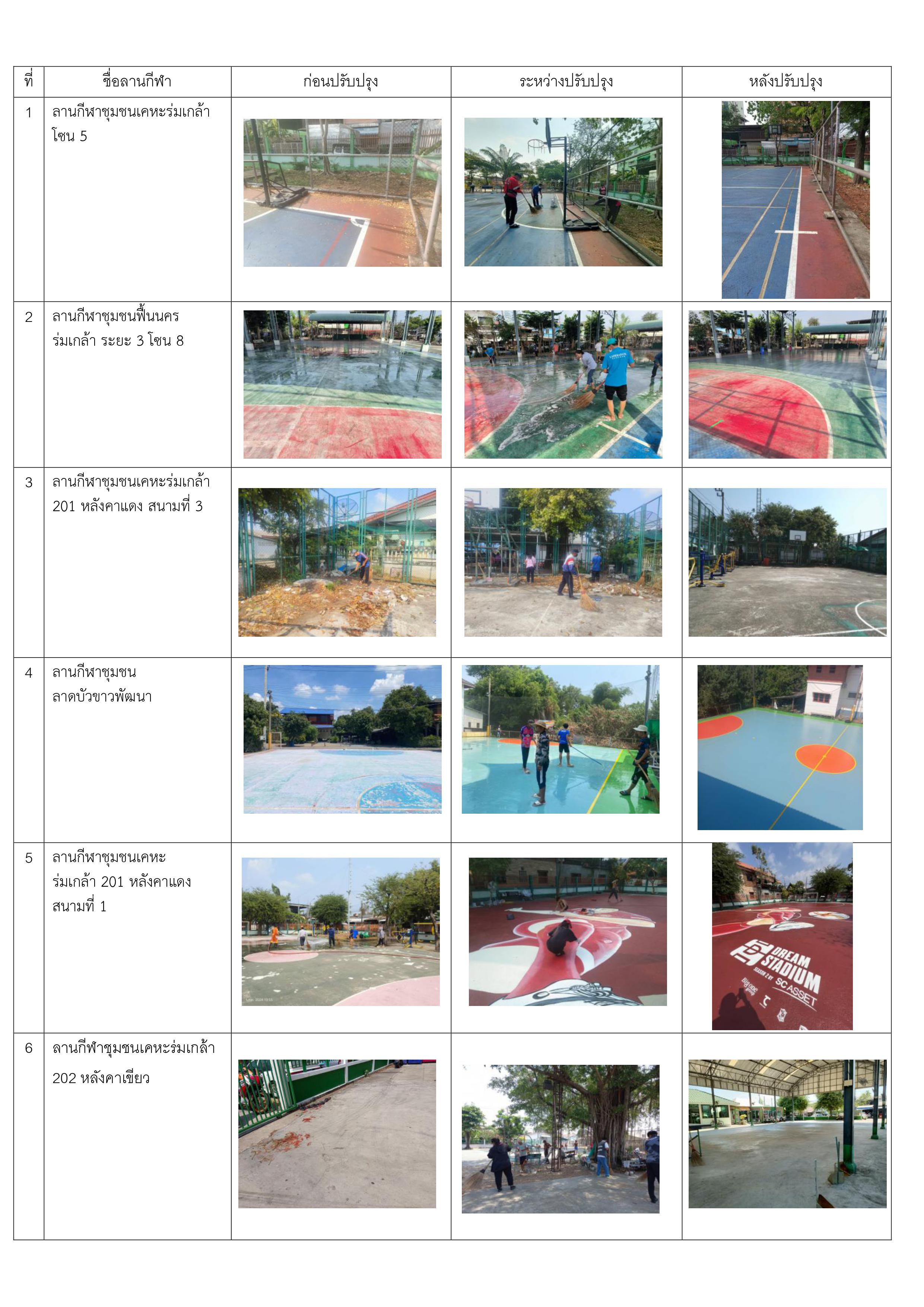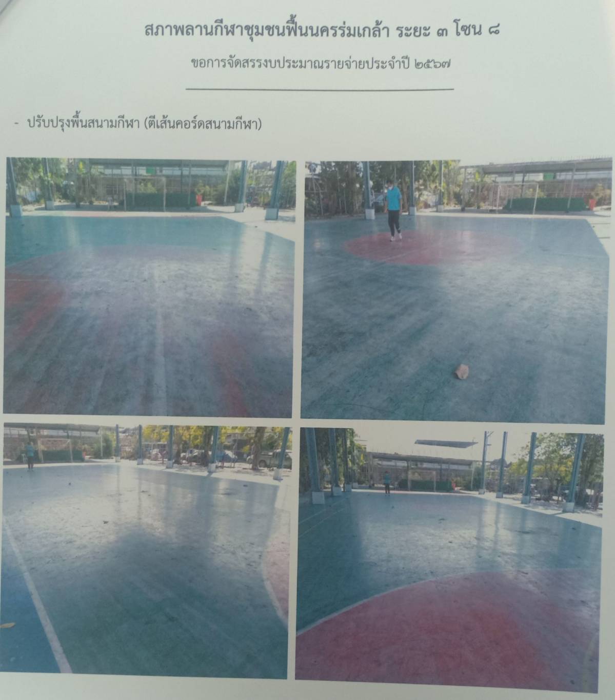| 13 | ![]() | 2024-04-05 00:00:00.0000000 | 0.00 | 0.00 | พัฒนา/ปรับปรุง ลานกีฬาเรียบร้อยแล้วเพิ่มอีก 3 กีฬา 1.ลานกีฬาชุมชนฟื้นนครร่มเกล้า ระยะ 3 โซน 8 - ล้างทำความสะอาด - เก็บขยะมูลฝอย 2.ลานกีฬาชุมชนเคหะร่มเกล้า 201 หลังคาแดง สนามที่ 1 - ซ่อมแซมรอยร้าว - ปรับปรุงเป็นสนามฟุตซอล Dream Stadium ซึ่งได้รับความร่วมมือจากบริษัท คิดไซด์โค้ง จำกัด ดำเนินการวาดภาพลายเส้นลิขสิทธิ์แท้จากผู้วาด "กัปตันสึบาสะ" 3.ลานกีฬาชุมชนเคหะร่มเกล้า 201 หลังคาแดง สนามที่ 3 - เก็บขยะมูลฝอย - ทำความสะอาดสนาม | ||