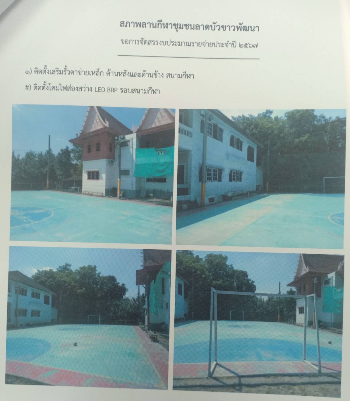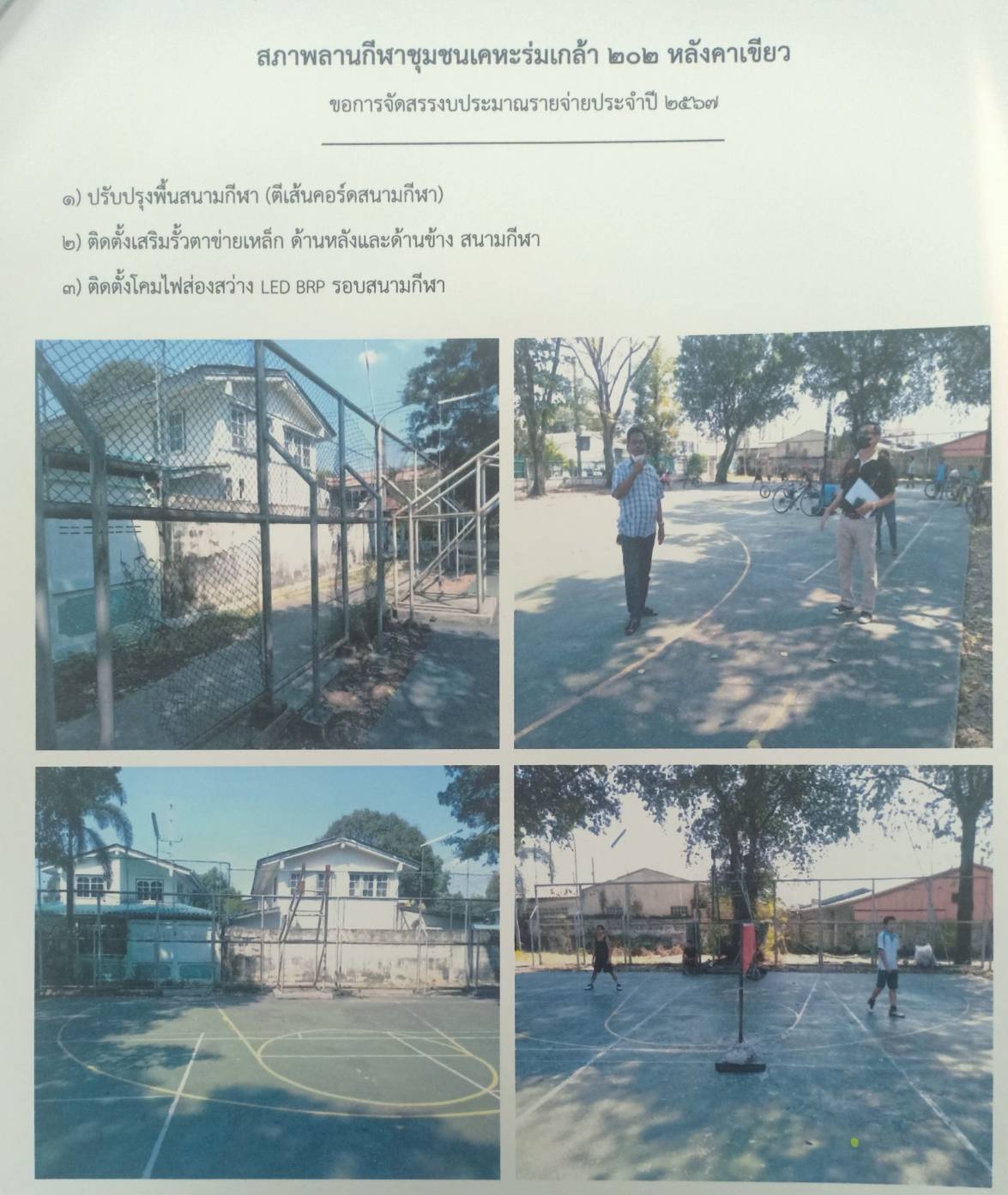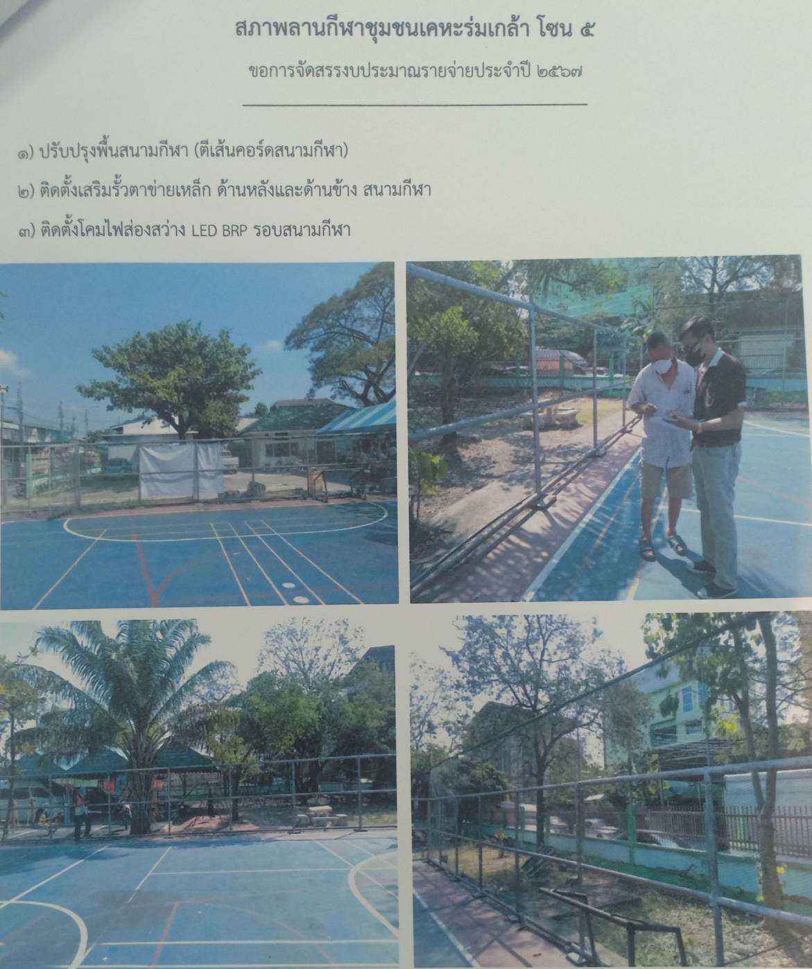 | 13 | ![]() | 2024-04-05 00:00:00.0000000 | 0.00 | 0.00 | พัฒนา/ปรับปรุง ลานกีฬาเรียบร้อยแล้วเพิ่มอีก 3 กีฬา 1.ลานกีฬาชุมชนฟื้นนครร่มเกล้า ระยะ 3 โซน 8 - ล้างทำความสะอาด - เก็บขยะมูลฝอย 2.ลานกีฬาชุมชนเคหะร่มเกล้า 201 หลังคาแดง สนามที่ 1 - ซ่อมแซมรอยร้าว - ปรับปรุงเป็นสนามฟุตซอล Dream Stadium ซึ่งได้รับความร่วมมือจากบริษัท คิดไซด์โค้ง จำกัด ดำเนินการวาดภาพลายเส้นลิขสิทธิ์แท้จากผู้วาด "กัปตันสึบาสะ" 3.ลานกีฬาชุมชนเคหะร่มเกล้า 201 หลังคาแดง สนามที่ 3 - เก็บขยะมูลฝอย - ทำความสะอาดสนาม | ||