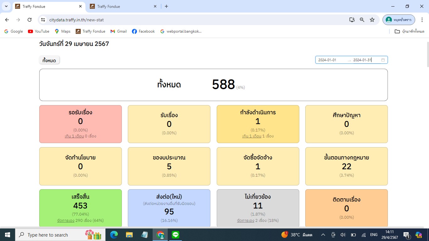 | 102 | ![]() | 2024-04-30 00:00:00.0000000 | 84.70 | 0.00 | สำนักงานเขตบางเขนรับเรื่องร้องเรียนประจำเดือนเมษายน 2567 ทั้งหมด 523 เรื่อง เสร็จสิ้น 443 เรื่อง | ||
