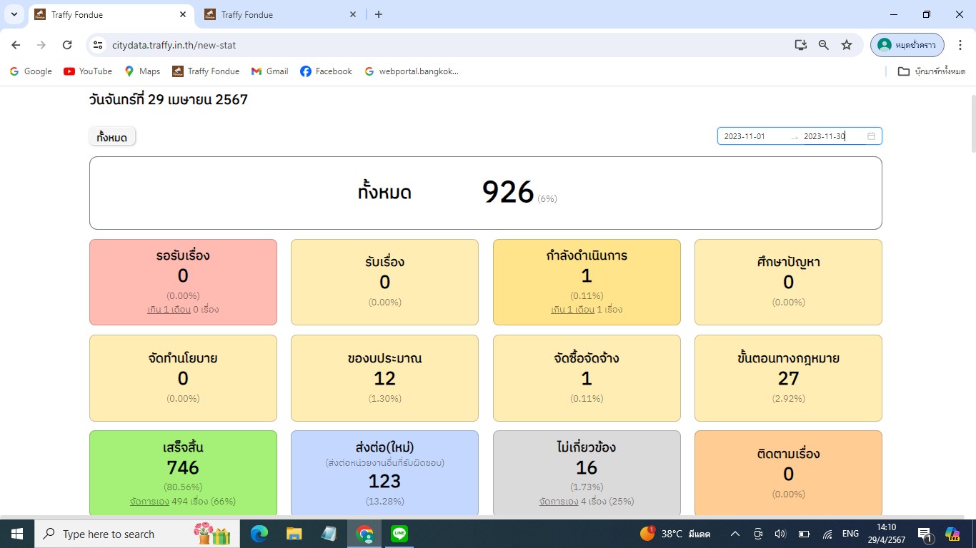 ![]() | 2 | ดำเนินการแก้ไขปัญหาร้องเรียน/ร้องทุกข์ ผ่านแพลตฟอร์ม Traffy fondue | 25.00 | 2023-10-01 00:00:00.0000000 | 2024-09-30 00:00:00.0000000 |