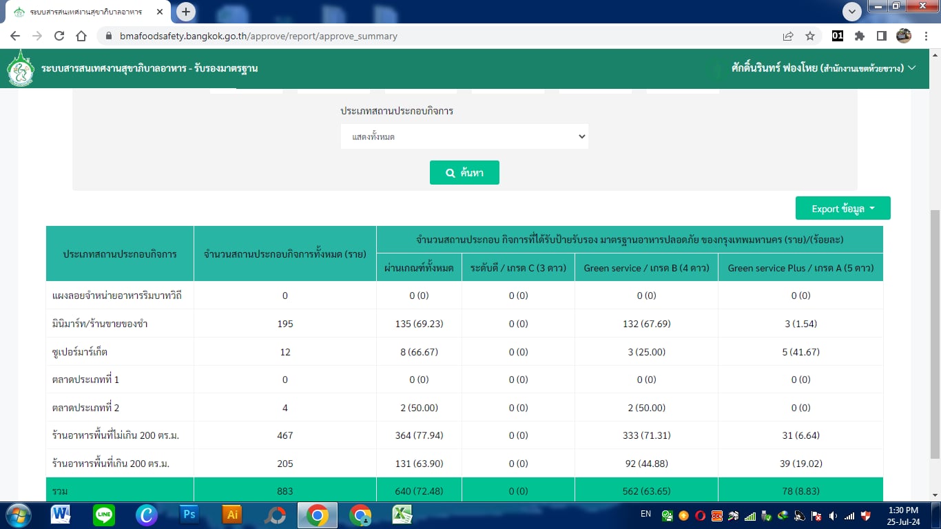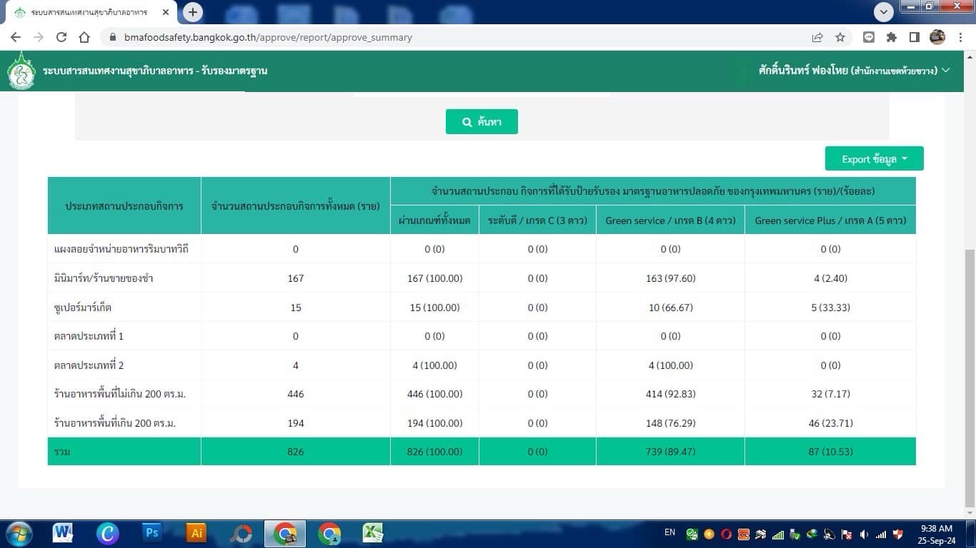 | 684 | ![]() | 2024-09-25 00:00:00.0000000 | 5.66 | 0.00 | ตรวจสอบเฝ้าระวังด้านสุขลักษณะ ความปลอดภัย และเก็บตัวอย่างอาหาร ณ สถานที่จำหน่ายอาหาร ซูเปอร์มาร์เก็ต มินิมาร์ท และสถานที่สะสมอาหาร เพื่อตรวจวิเคราะห์หาการปนเปื้อนจุลินทรีย์และเชื้อโคลิฟอร์มแบคทีเรีย จำนวน 826 ราย จากจำนวนสถานประกอบการที่มีใบอนุญาตในพื้นที่เขตห้วยขวางทั้งหมด 826 ราย | ||