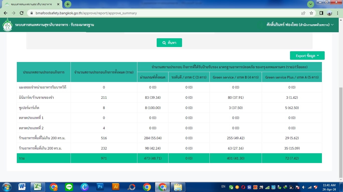 | 684 | ![]() | 2024-04-24 00:00:00.0000000 | 14.62 | 0.00 | ตรวจสอบเฝ้าระวังด้านสุขลักษณะ ความปลอดภัย และเก็บตัวอย่างอาหาร ณ สถานที่จำหน่ายอาหาร ซูเปอร์มาร์เก็ต มินิมาร์ท และสถานที่สะสมอาหาร เพื่อตรวจวิเคราะห์หาการปนเปื้อนจุลินทรีย์และเชื้อโคลิฟอร์มแบคทีเรีย จำนวน 473 ราย จากจำนวนสถานประกอบการทั้งหมด 971 ราย | ||