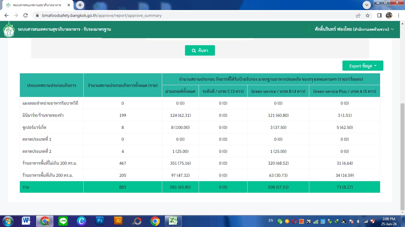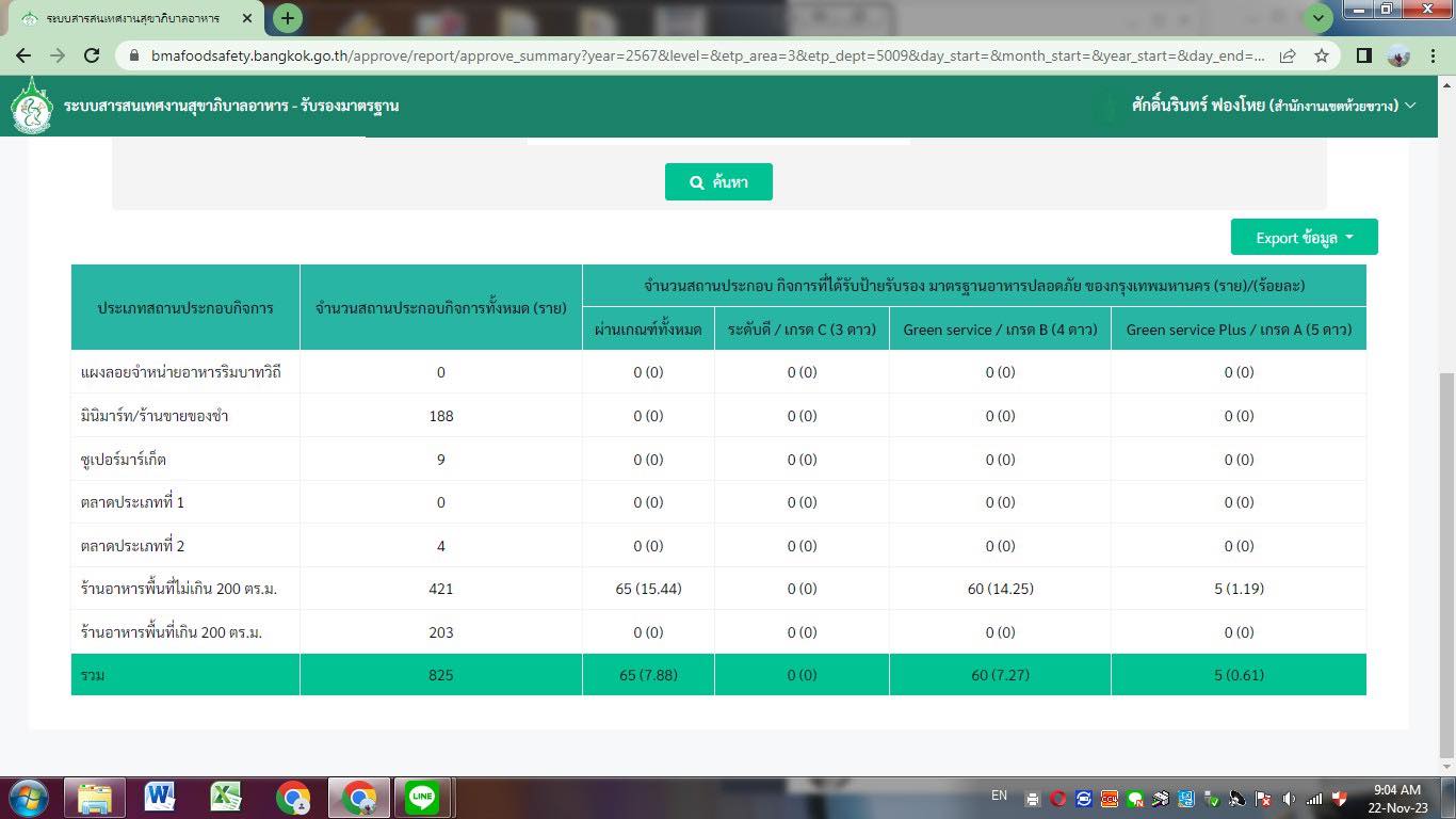 | 684 | ![]() | 2024-08-26 00:00:00.0000000 | 20.15 | 0.00 | ตรวจสอบเฝ้าระวังด้านสุขลักษณะ ความปลอดภัย และเก็บตัวอย่างอาหาร ณ สถานที่จำหน่ายอาหาร ซูเปอร์มาร์เก็ต มินิมาร์ท และสถานที่สะสมอาหาร เพื่อตรวจวิเคราะห์หาการปนเปื้อนจุลินทรีย์และเชื้อโคลิฟอร์มแบคทีเรีย จำนวน 746 ราย จากจำนวนสถานประกอบการที่มีใบอนุญาตในพื้นที่เขตห้วยขวางทั้งหมด 835 ราย | ||