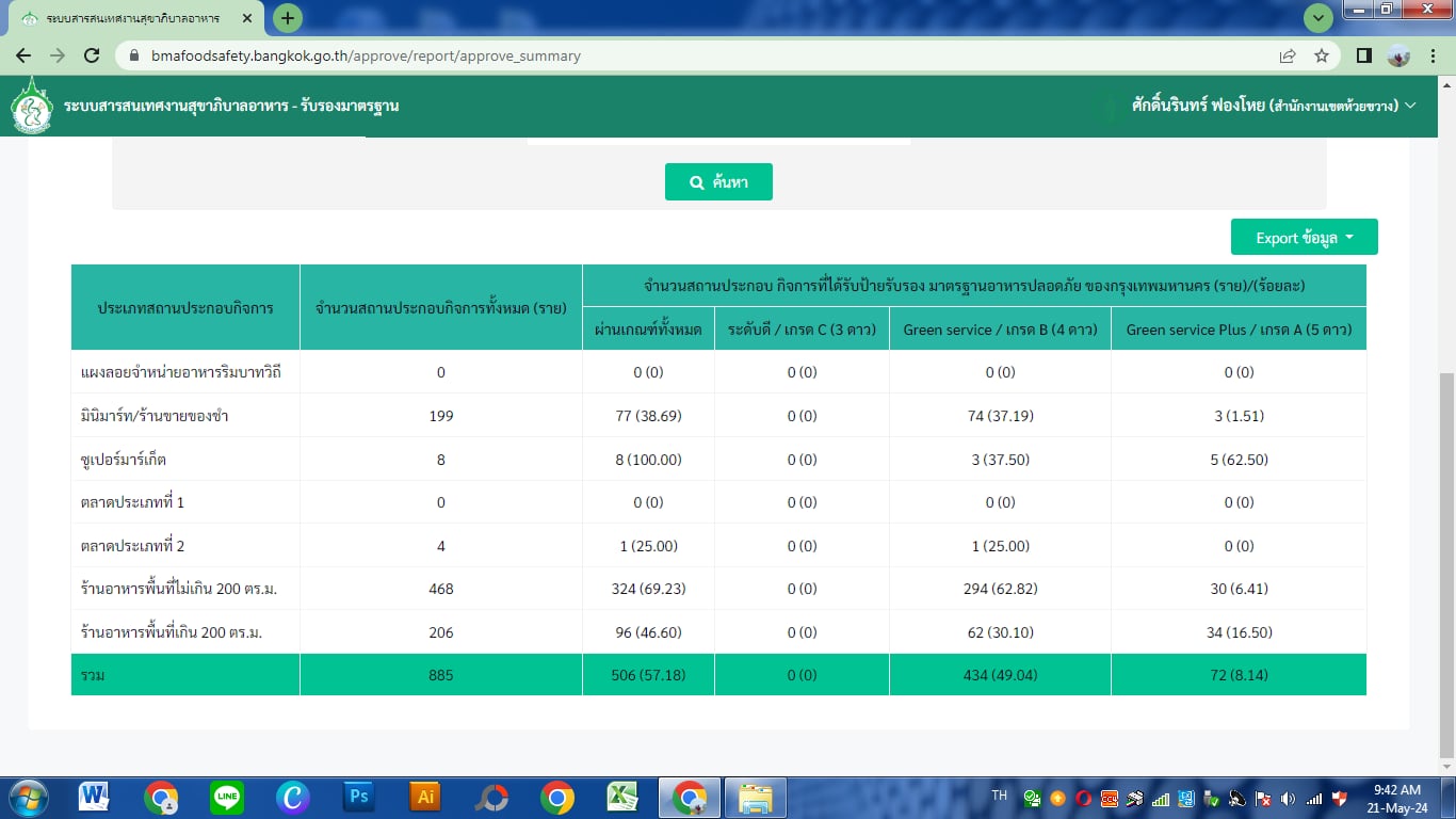 | 684 | ![]() | 2024-05-21 00:00:00.0000000 | 8.47 | 0.00 | ตรวจสอบเฝ้าระวังด้านสุขลักษณะ ความปลอดภัย และเก็บตัวอย่างอาหาร ณ สถานที่จำหน่ายอาหาร ซูเปอร์มาร์เก็ต มินิมาร์ท และสถานที่สะสมอาหาร เพื่อตรวจวิเคราะห์หาการปนเปื้อนจุลินทรีย์และเชื้อโคลิฟอร์มแบคทีเรีย จำนวน 506 ราย จากจำนวนสถานประกอบการทั้งหมด 885 ราย | ||