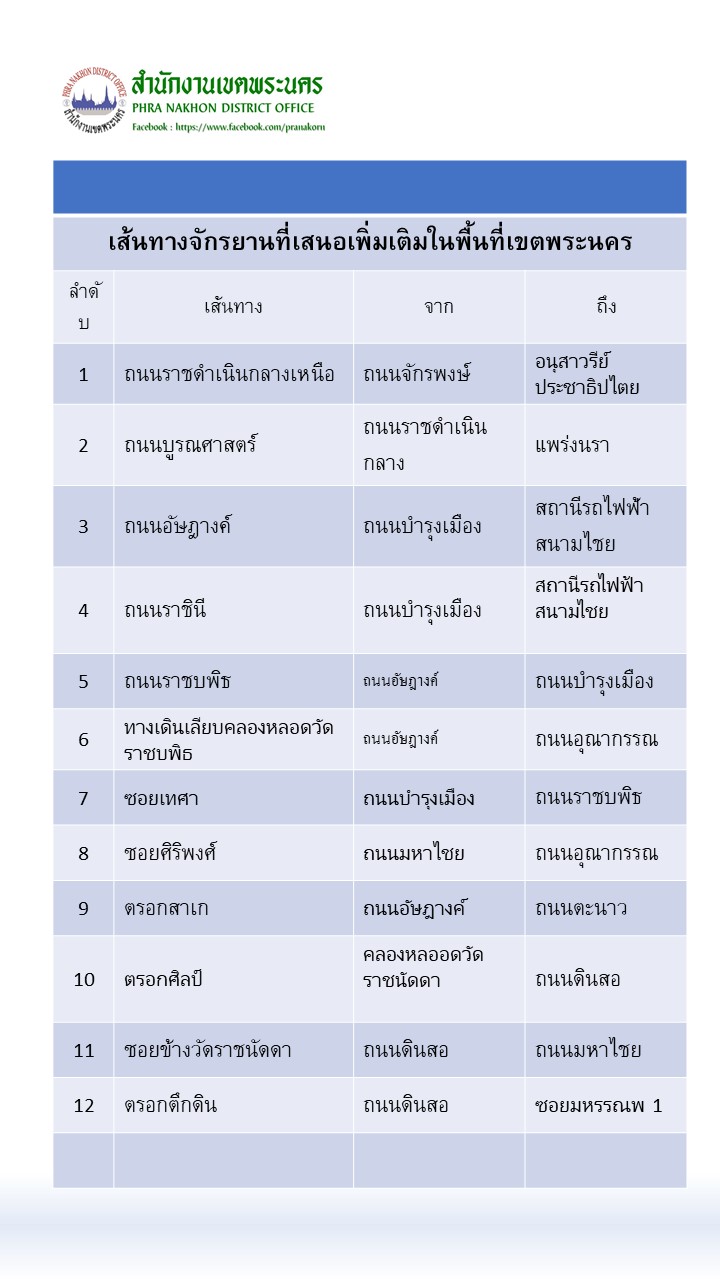 -ปรับปรุงทางจักรยาน (กม.)0.0095.00สำนักงานเขตพระนครฝ่ายปกครอง
