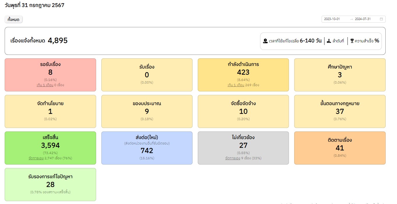 | 1363 | ![]() | 2024-07-31 00:00:00.0000000 | 73.00 | 0.00 | ผลการดำเนินการแก้ไขเรื่องเรียนผ่านระบบ Traffy Fondue ระหว่างวันที่ 1 ต.ค. 66 - 31 ก.ค. 67 มีรายละเอียดดังนี้ รอรับเรื่อง 8 (0.16%) / รับเรื่อง 0 (0%) / กำลังดำเนินการ 423 (8.64%) / ศึกษาปัญหา 3 (0.06%) / จัดทำนโยบาย 1 (0.02%) / ของบประมาณ 9 (0.18%) / จัดซื้อจัดจ้าง 10 (0.20%) / ขั้นตอนทางกฎหมาย 37 (0.76%) / เสร็จสิ้น 3,594 (73.42%) - จัดการเอง 2,747 (76%) / ส่งต่อใหม่ 742 (15.16%) / ไม่เกี่ยวข้อง 27 (0.55%) / ติดตามเรื่อง 41 (0.84%) / รับรองการแก้ไขปัญหา 28 (0.78%) | ||