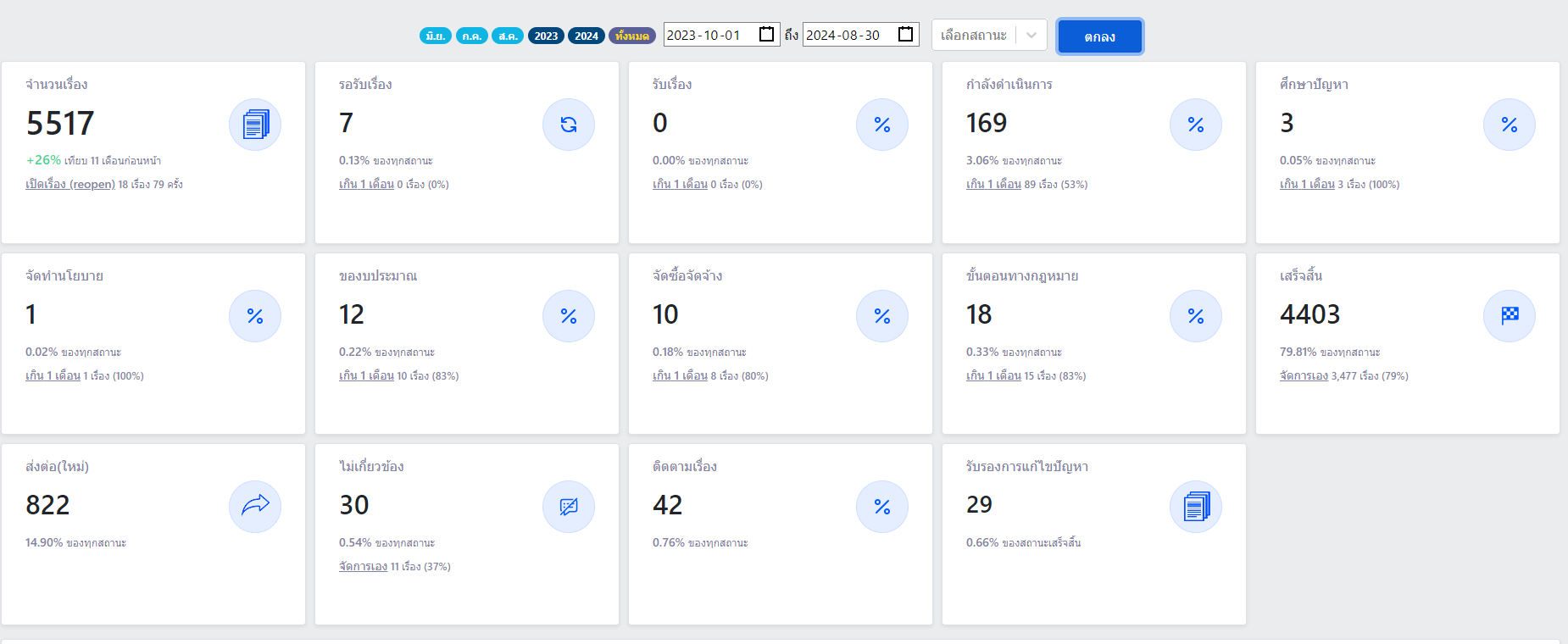 | 1363 | ![]() | 2024-08-30 00:00:00.0000000 | 79.00 | 0.00 | ผลการดำเนินการแก้ไขเรื่องเรียนผ่านระบบ Traffy Fondue ระหว่างวันที่ 1 ต.ค. 66 - 30 ส.ค. 67 มีรายละเอียดดังนี้ จำนวนเรื่องทั้งหมด 5515 / รอรับเรื่อง 7 (0.13%) / รับเรื่อง 7 (0.13%) / กำลังดำเนินการ 166 (3.01%) / ศึกษาปัญหา 3 (0.05%) / จัดทำนโยบาย 1 (0.02%) / ของบประมาณ 12 (0.22%) / จัดซื้อจัดจ้าง 10 (0.18%) / ขั้นตอนทางกฎหมาย 18 (0.33%) / เสร็จสิ้น 4404 (79.85%) - จัดการเอง 3,477 (79%) / ส่งต่อใหม่ 822 (14.90%) / ไม่เกี่ยวข้อง 30 (0.54%) / ติดตามเรื่อง 42 (0.46%) / รับรองการแก้ไขปัญหา 29 (0.66%) | ||