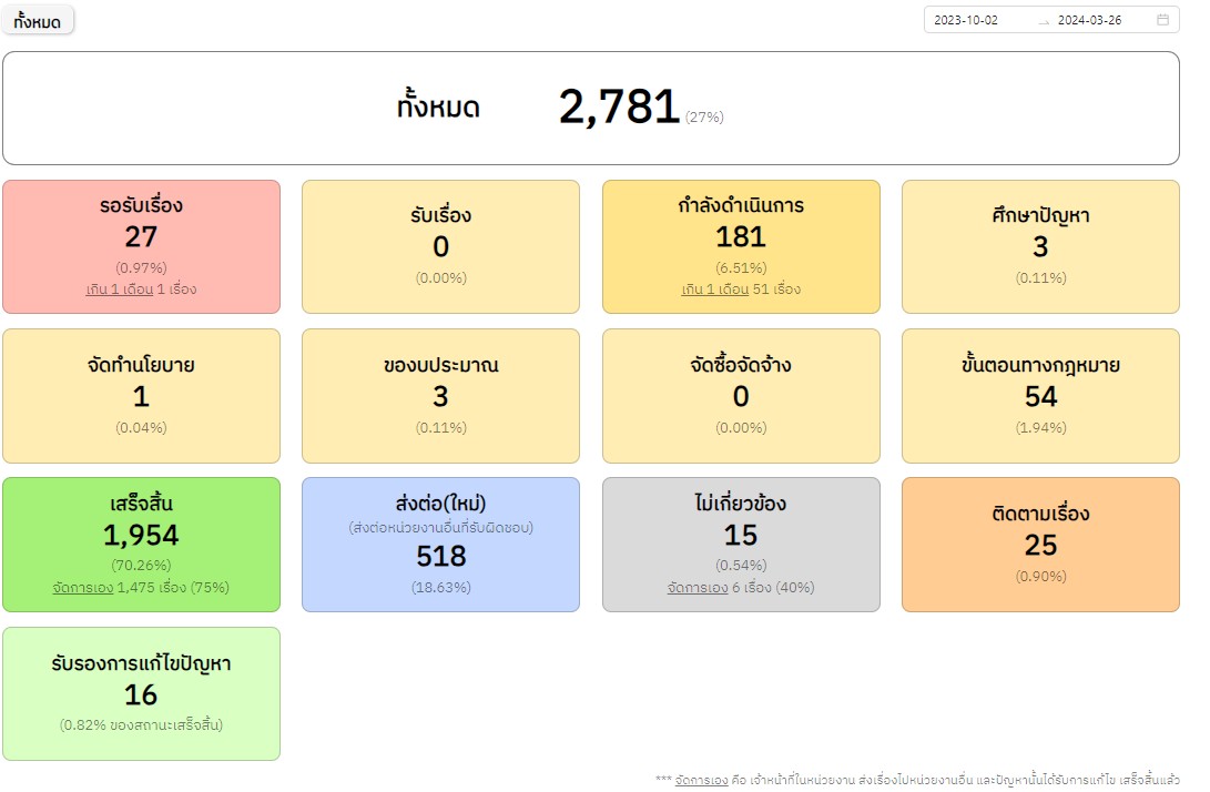 | 1363 | ![]() | 2024-03-27 00:00:00.0000000 | 75.00 | 0.00 | ผลการดำเนินการแก้ไขเรื่องเรียนผ่านระบบ Traffy Fondue ระหว่างวันที่ 2 ต.ค. 66 - 26 มี.ค. 57 มีรายละเอียดดังนี้ รอรับเรื่อง 27 (0.97%) / รับเรื่อง 0 (0%) / กำลังดำเนินการ 181 (6.51%) / ศึกษาปัญหา 3 (0.11%) / จัดทำนโยบาย 1 (0.04%) / ของบประมาณ 3 (0.11%) จัดซื้อจัดจ้าง 0 (0%) / ขั้นตอนทางกฎหมาย 54 (1.94%) / เสร็จสิ้น 1954 (70.26%) - จัดการเอง 1,475 (75%) / ส่งต่อใหม่ 518 (18.63%) / ไม่เกี่ยวข้อง 15 (0.54%) ติดตามเรื่อง 25 (0.90%) / รับรองการแก้ไขปัญหา 16 (0.82%) | ||