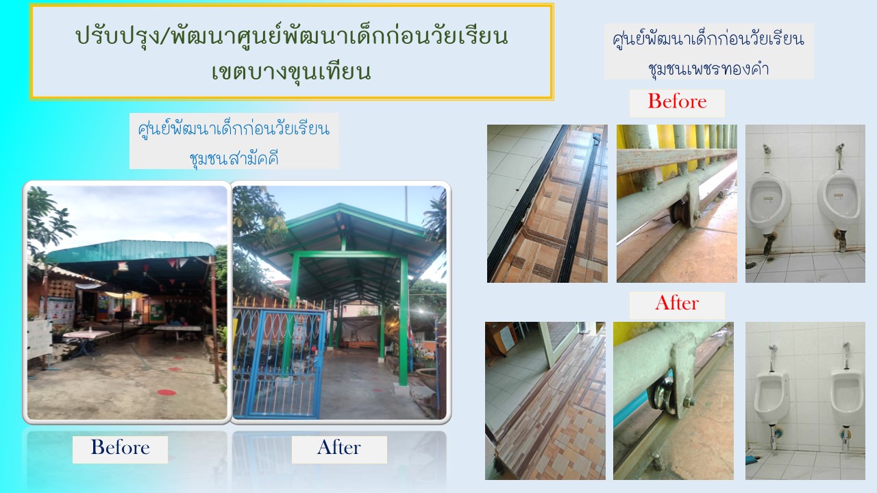 152024-04-29 00:00:00.00000002.000.00 ปรับปรุงศูนย์พัฒนาเด็กก่อนวัยเรียนในพื้นที่เขตบางขุนเทียน จำนวน 2 แห่ง ได้แก่ ศูนย์พัฒนาเด็กก่อนวัยเรียนชุมชนเพชรทองคำ และศูนย์พัฒนาเด็กก่อนวัยเรียนชุมชนสามัคคี