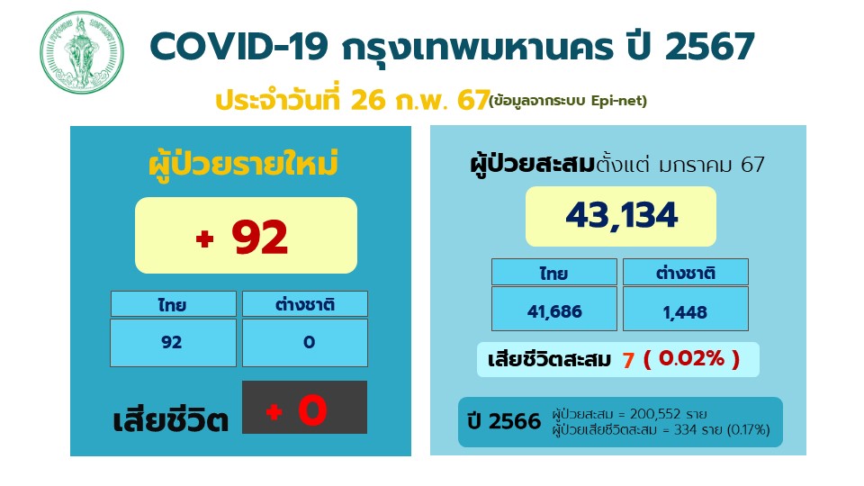 | 689 | ![]() | 2024-02-27 00:00:00.0000000 | 0.00 | 0.00 | อัตราป่วยตายด้วยโรคติดเชื้อไวรัสโคโรนา 2019 (โควิด 19) กรุงเทพมหานคร ปี 2567 ข้อมูล ณ วันที่ 26 กุมภาพันธ์ 2567 (อัตราป่วยตาย = จำนวนเสียชีวิตสะสมx100/จำนวนผู้ป่วยสะสม) 7x100/43,134 = 0.02 | ||