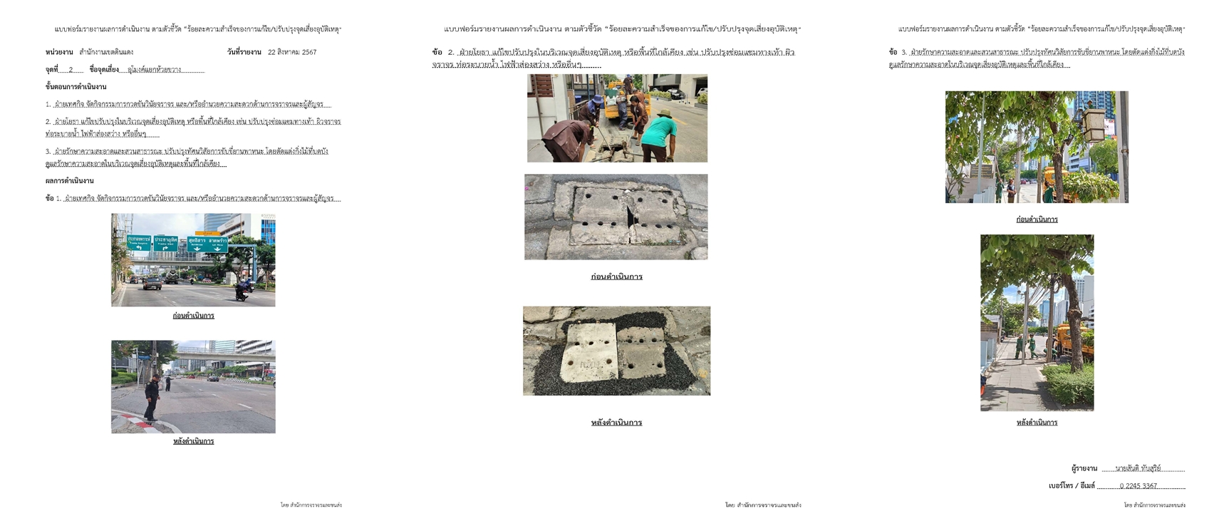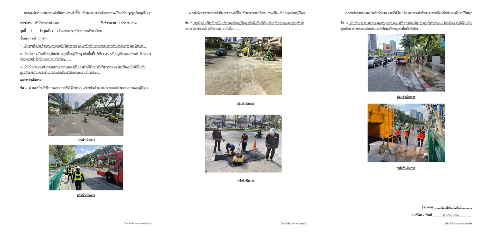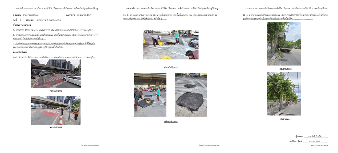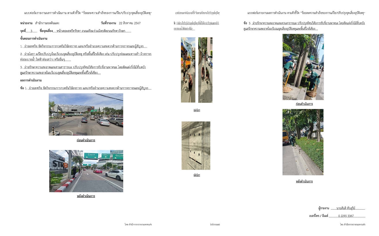 | 11 | ![]() | 2024-09-30 00:00:00.0000000 | 0.00 | 0.00 | รายงานผลการดำเนินการแก้ไขปรับปรุงจุดเสี่ยง ครั้งที่ 2 (22 สิงหาคม 2567) จุดที่ 3 หน้าเดอะสตรีทรัชดา ถนนเทียมร่วมมิตรตัดถนนรัชดาภิเษก | ||