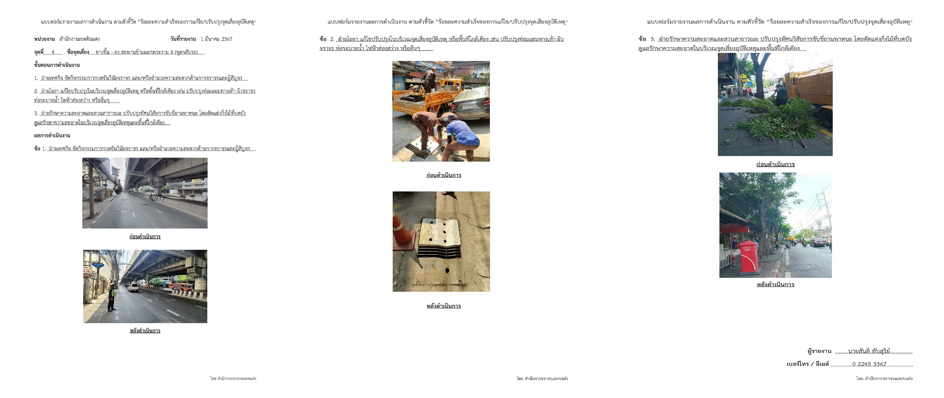 | 11 | ![]() | 2024-09-30 00:00:00.0000000 | 0.00 | 0.00 | รายงานผลการดำเนินการแก้ไขปรับปรุงจุดเสี่ยง ครั้งที่ 2 (22 สิงหาคม 2567) จุดที่ 4 ทางขึ้น - ลง สะพานข้ามแยกพระราม 9 (จุดกลับรถ) | ||