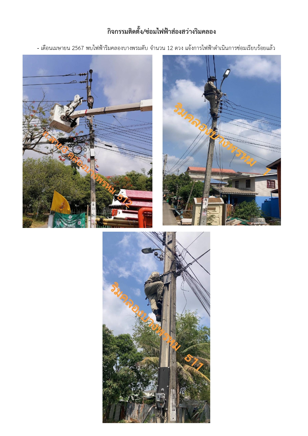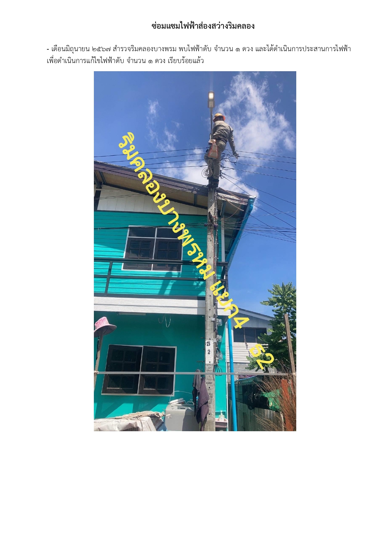 ![]() | 10 | ดำเนินการสำรวจ ตรวจสอบความพร้อมใช้งาน และติดตั้ง/ซ่อม ไฟฟ้าส่องสว่างริมคลองที่มีการชำรุด เดือน มิ.ย. 2567 | 5.00 | 2024-06-01 00:00:00.0000000 | 2024-06-30 00:00:00.0000000 |