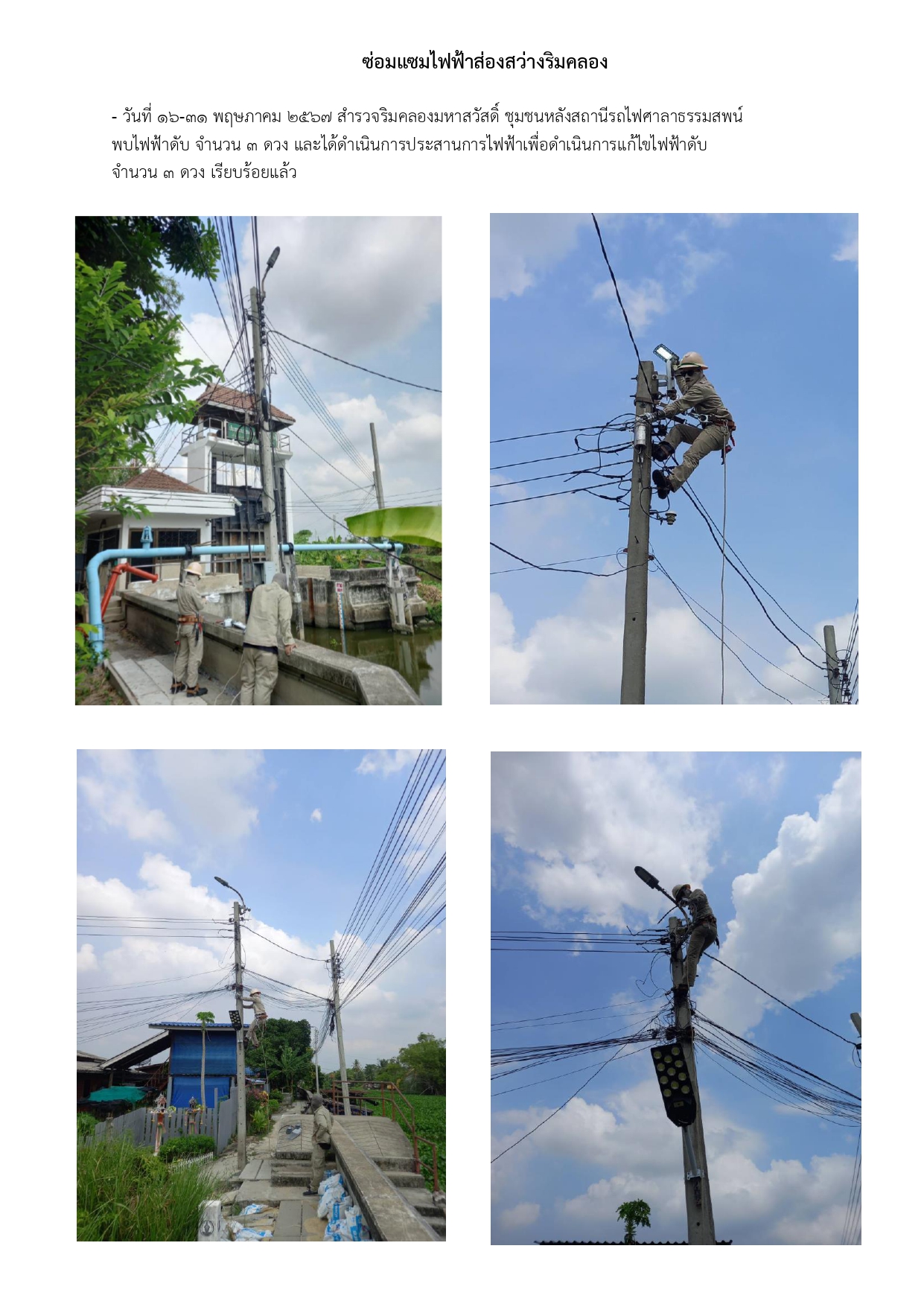 | 6 | ![]() | 2023-11-01 00:00:00.0000000 | 0.00 | 0.00 | อยู่ระหว่างดำเนินการสำรวจไฟฟ้าริมคลอง |