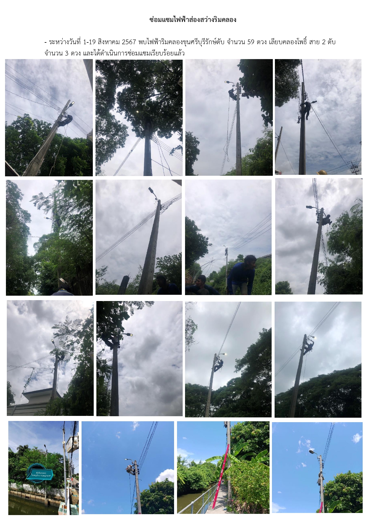 ![]() | 12 | ดำเนินการสำรวจ ตรวจสอบความพร้อมใช้งาน และติดตั้ง/ซ่อม ไฟฟ้าส่องสว่างริมคลองที่มีการชำรุด เดือน ส.ค. 2567 | 5.00 | 2024-08-01 00:00:00.0000000 | 2024-08-31 00:00:00.0000000 |