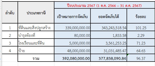 | 147 | ![]() | 2024-02-29 00:00:00.0000000 | 0.00 | 0.00 | เป้าหมายการจัดเก็บ 339,000,000.00 /ยอดจัดเก็บ 35,402,621.51 คิดเป็นร้อยละ 10.44 (ณ 20 ก.พ.67) | ||