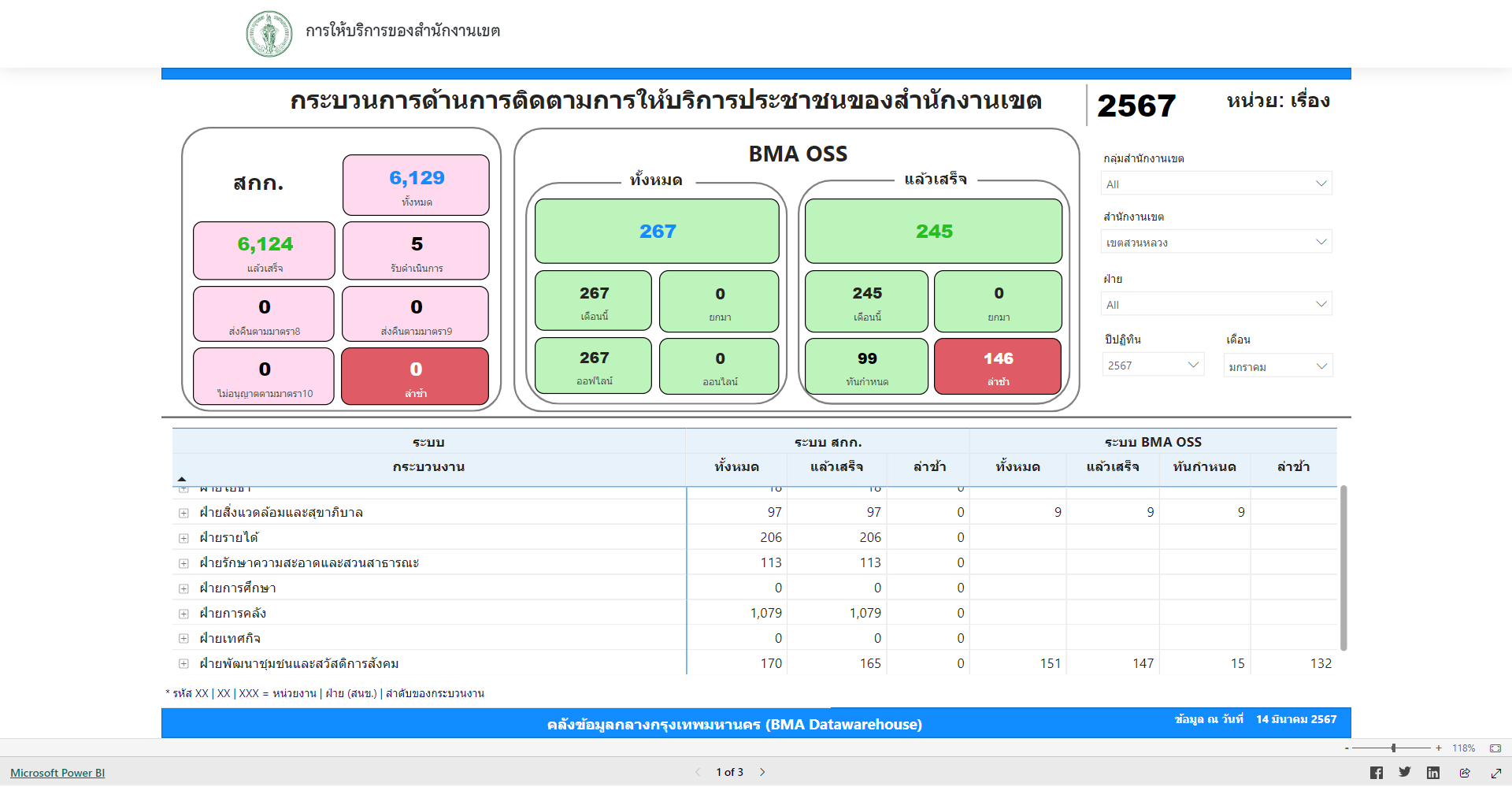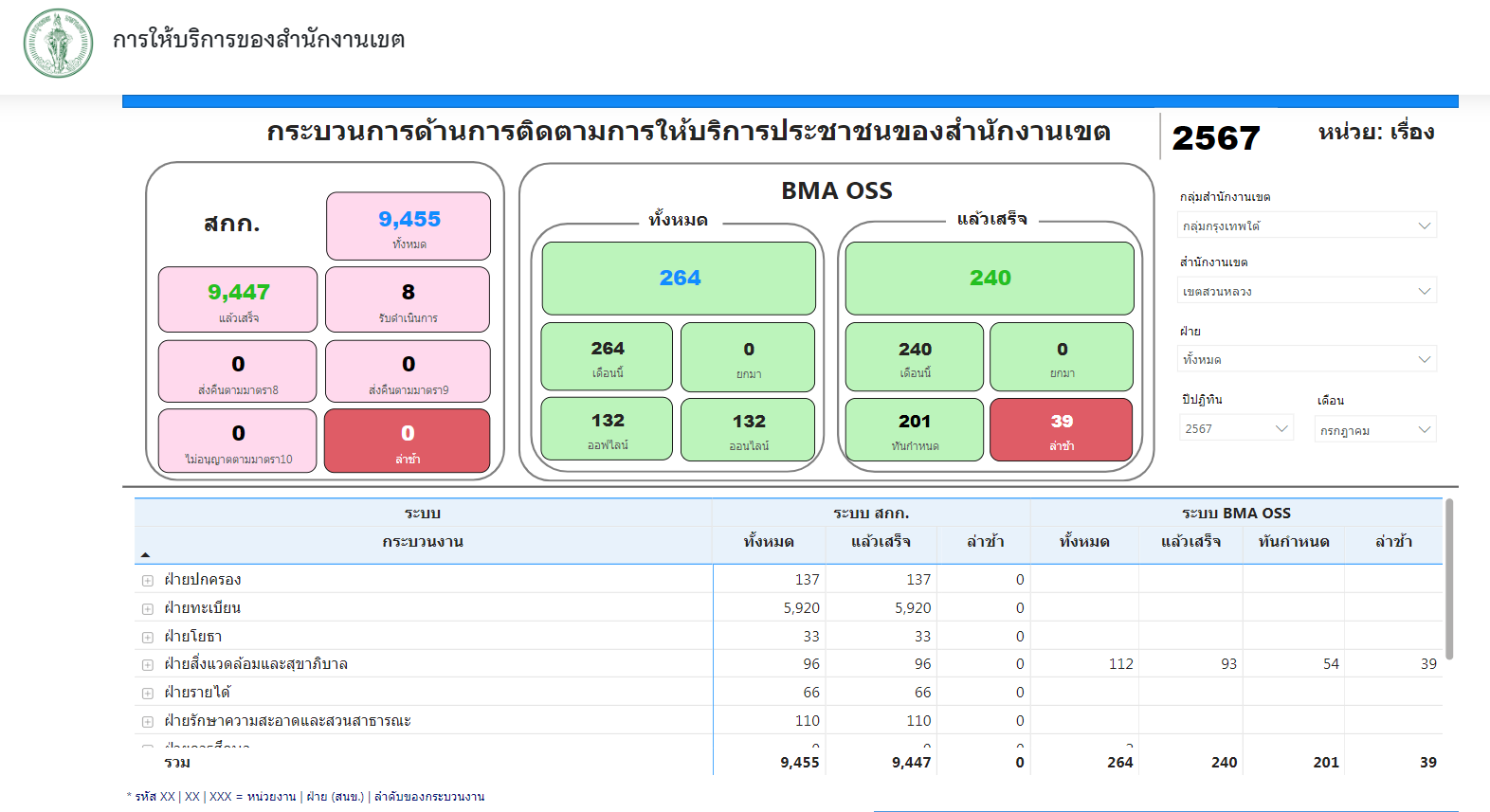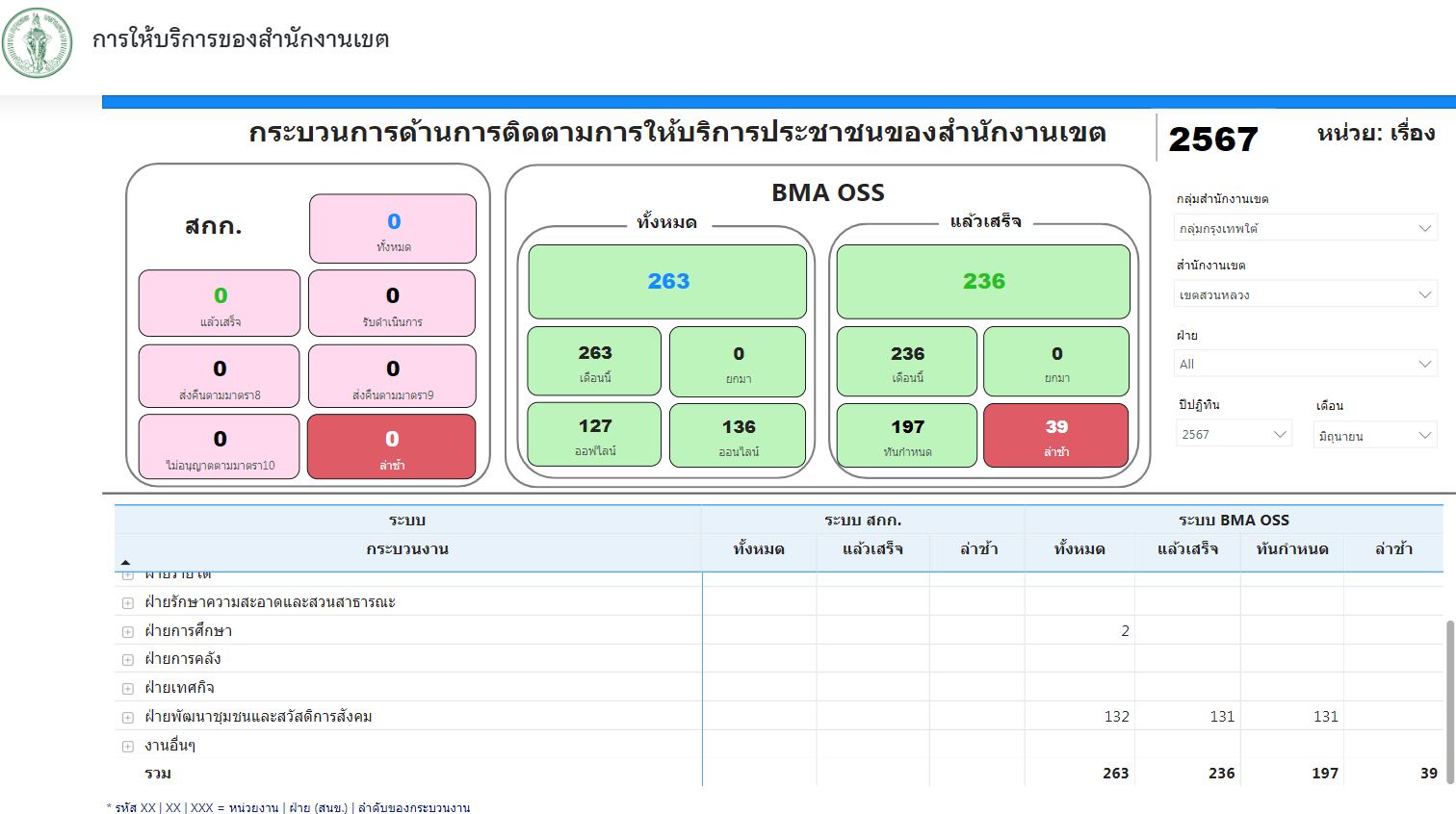 | 21 | ![]() | 2024-07-31 00:00:00.0000000 | 100.00 | 0.00 | จำนวนคำขอที่เขตสามารถให้บริการได้ภายในกรอบเวลาตามคู่มือประชาชน ประจำเดือนกรกฎาคม 2567 จำนวน 9455 ราย แล้วเสร็จ 9447 ราย รับดำเนินการ 8 ราย - ปกครอง 137กระบวนงาน แล้วเสร็จ 137 กระบวนงาน - ทะเบียน 5,920 กระบวนงาน แล้วเสร็จ 5,920 กระบวนงาน - โยธา 33 กระบวนงาน แล้วเร็จ 33 กระบวนงาน - สิ่งแวดล้อมฯ 96 ระบวนงาน แล้วเสร็จ 96 กระบวนงาน - รายได้ 66 กระบวนงาน แล้วเสร็จ 66 กระบวนงาน - รักษาฯ 110 กระบวนงาน แล้วเสร็จ 110 กระบวนงาน - การศึกษา 0 กระบวนงาน - การคลัง 2,938 กระบวนงาน แล้วเสร็จ 12,938 กระบวนงาน - เทศกิจ 0 กระบวนงาน - พัฒนาชุมชนฯ 155 กระบวนงาน แล้วเสร็จ 147 กระบวนงาน | ||