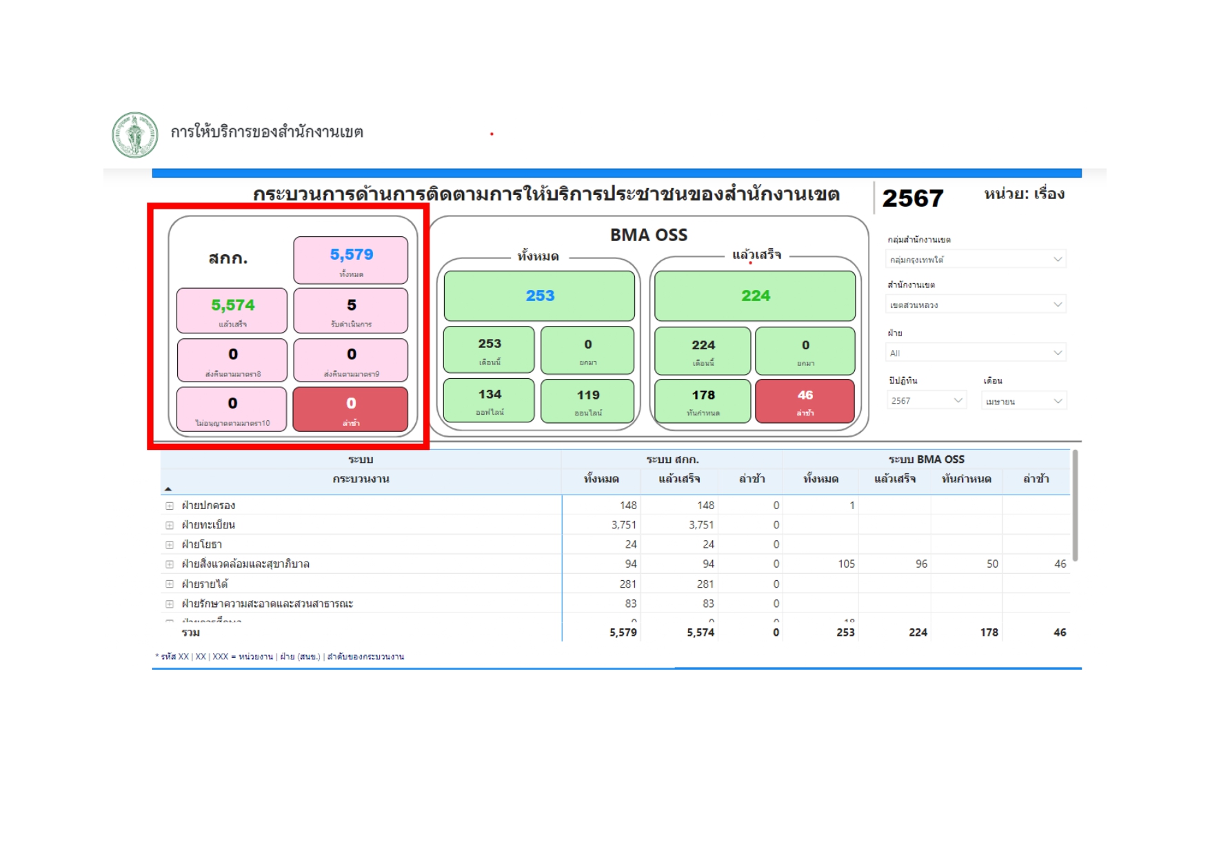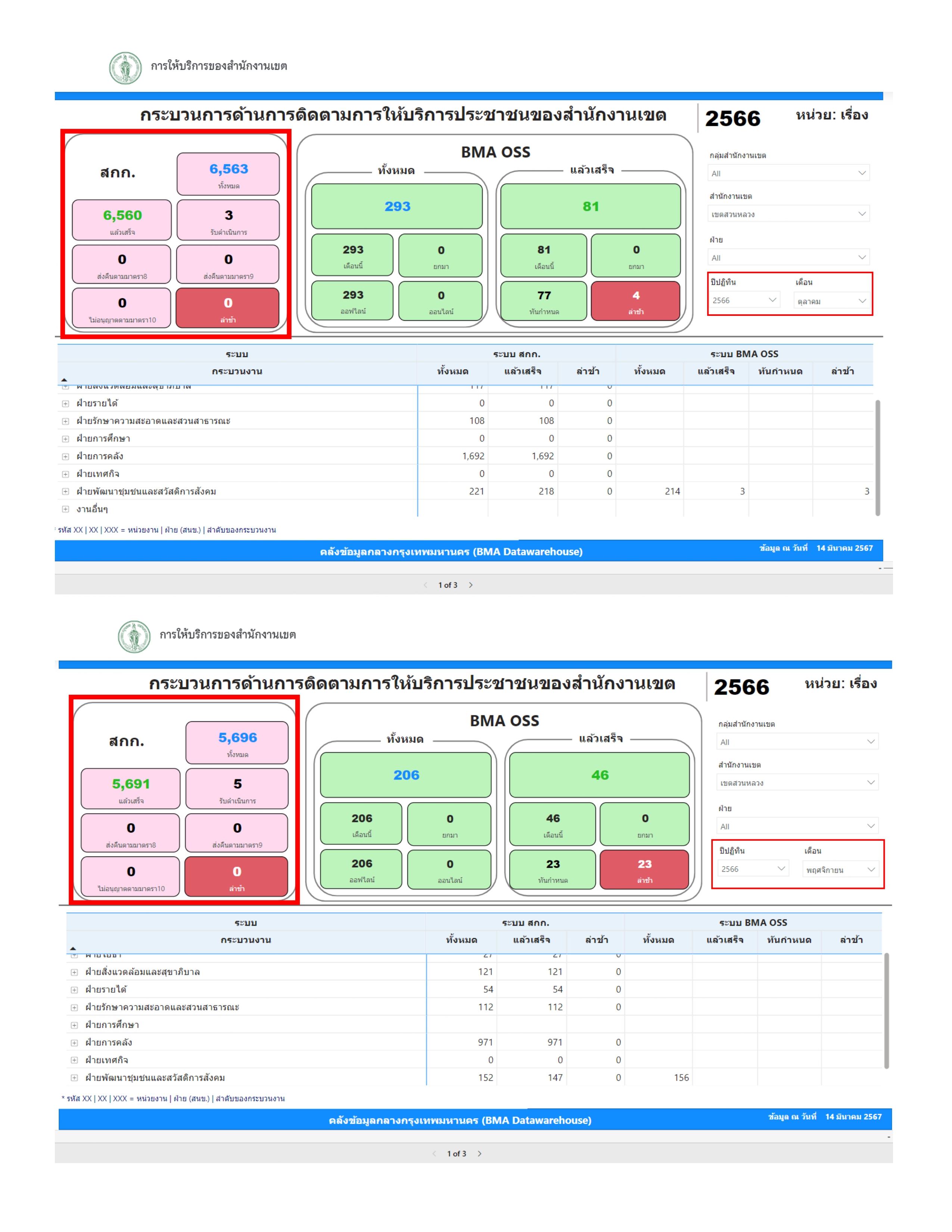 | 21 | ![]() | 2024-07-01 00:00:00.0000000 | 100.00 | 0.00 | จำนวนคำขอที่เขตสามารถให้บริการได้ภายในกรอบเวลาตามคู่มือประชาชน ประจำเดือนตุลาคม 2566 จำนวน 6,563 ราย แล้วเสร็จ 6,560 ราย รับดำเนินการ 3 ราย - ปกครอง 105 กระบวนงาน แล้วเสร็จ 105 กระบวนงาน - ทะเบียน 4297 กระบวนงาน แล้วเสร็จ 4297 กระบวนงาน - โยธา 23 กระบวนงาน แล้วเร็จ 23 กระบวนงาน - สิ่งแวดล้อมฯ 117 กระบวนงาน แล้วเสร็จ 117 กระบวนงาน - รายได้ 0 กระบวนงาน - รักษาฯ 108 กระบวนงาน แล้วเสร็จ 108 กระบวนงาน - การศึกษา 0 กระบวนงาน - การคลัง 1692 กระบวนงาน แล้วเสร็จ 1692 กระบวนงาน - เทศกิจ 0 กระบวนงาน - พัฒนาชุมชนฯ 221 กระบวนงาน แล้วเสร็จ 218 กระบวนงาน | ||