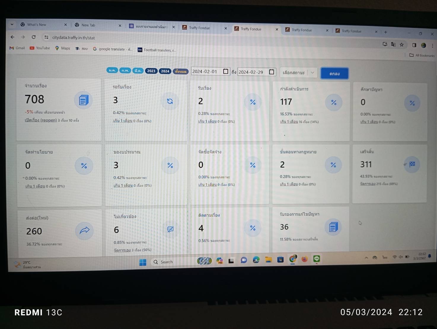 1022024-03-05 00:00:00.000000069.420.00ก.พ. 67 จำนวนเรื่อง 708 เสร็จสิ้น 311 ส่งต่อ 260 คิดเป็น 69.42%