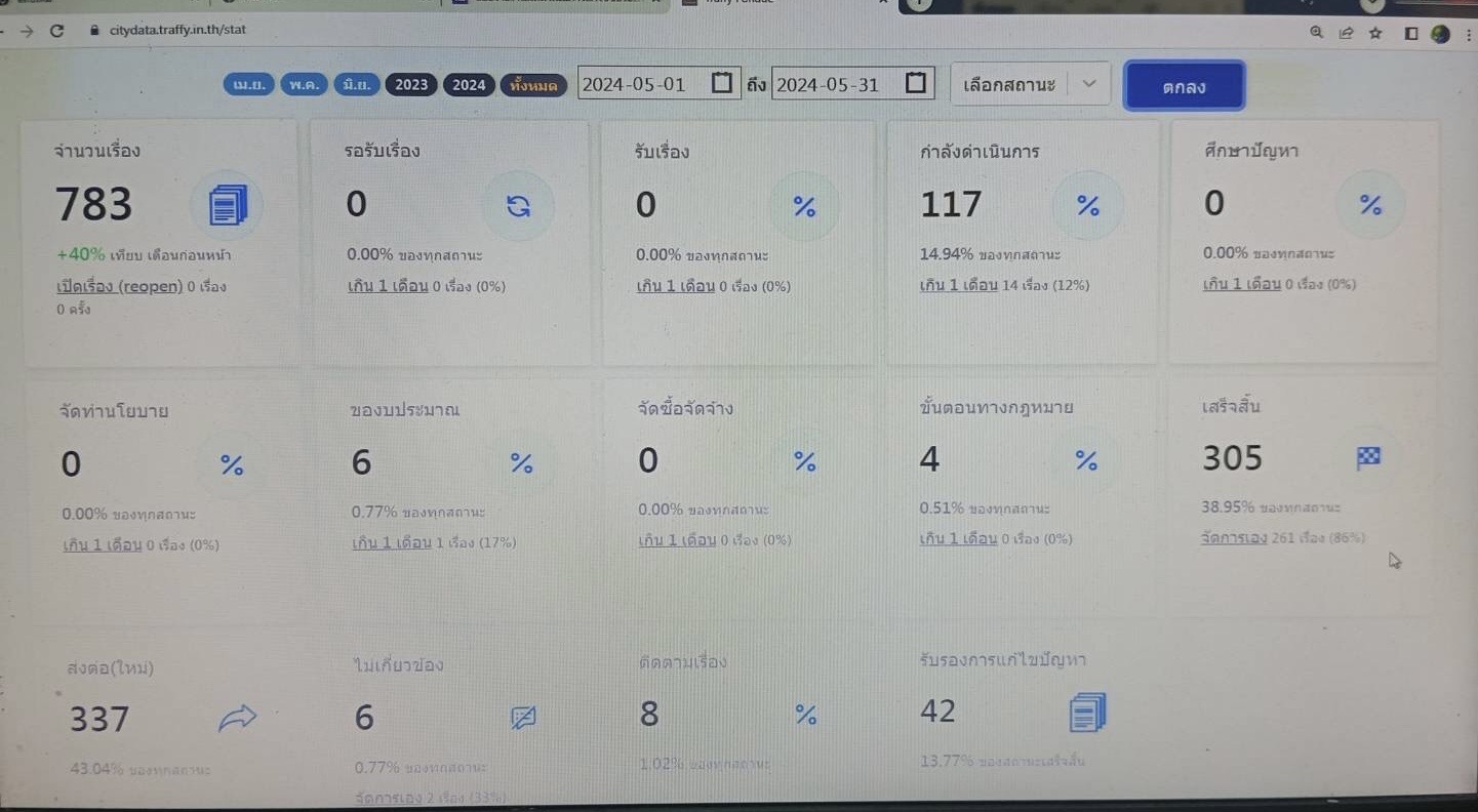 1022024-06-05 00:00:00.000000068.390.00พ.ค. 67 จำนวนเรื่อง 783 เสร็จสิ้น 305 ส่งต่อ 337 คิดเป็น 68.39 %