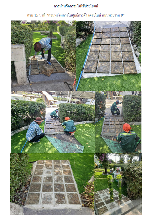 3. การนำนวัตกรรมไปใช้ประโยขน์ ในสถานที่ต่างๆ เช่น วัด โรงเรียน ชุมชน และสวน 15 นาที ในพื้นที่เขตสวนหลวง โดยปัจจุบันนำไปใช้ในสวน 15 นาทีแล้วจำนวน 1 แห่ง