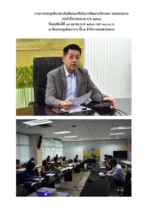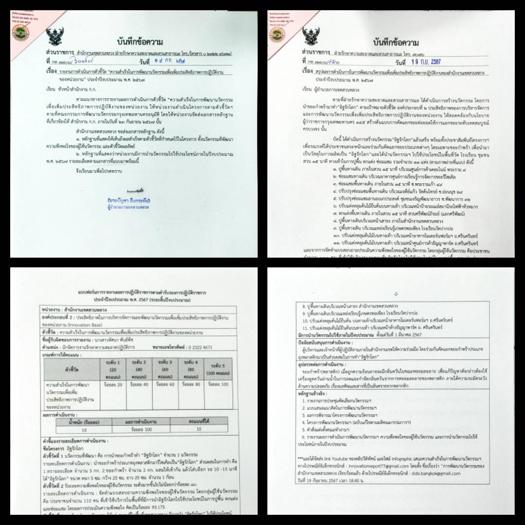| 1413 |  | 2024-09-20 00:00:00.0000000 | 1.00 | 0.00 |  | รายงานสรุปผลการดำเนินการตัวชี้วัด "ความสำเร็จในการพัฒนานวัตกรรมเพื่อเพิ่มประสิทธิภาพการปฏิบัติงานของสำนักงานเขตสวนหลวง ประจำปีงบประมาณ พ.ศ. 2567 | |