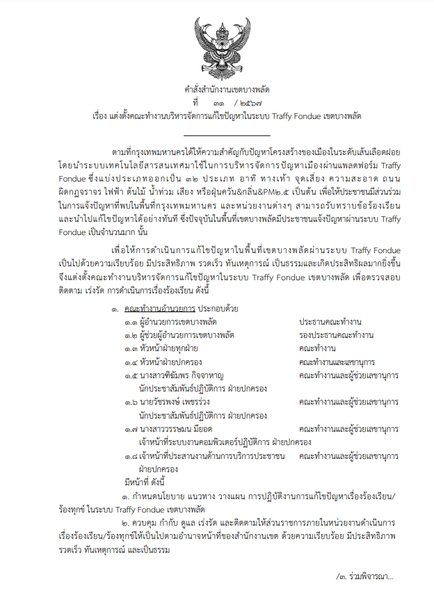 ![]() | กิจกรรมการแก้ไขปัญหาข้อร้องเรียนของประชาชนกรณีร้องเรียนผ่านแพลตฟอร์ม Traffy Fondue ของกรุงเทพมหานคร | 0.00 | 100.00 | สำนักงานเขตบางพลัด | ฝ่ายปกครอง |