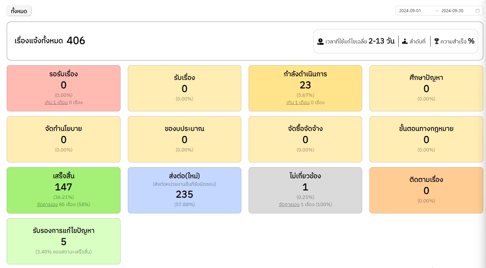![]() | 14 | ดำเนินการแก้ไขปัญหาข้อร้องเรียน ที่ได้รับจากแพลตฟอร์ม Traffy Fondue ประจำเดือนกันยายน | 5.00 | 2024-09-01 00:00:00.0000000 | 2024-09-30 00:00:00.0000000 |
