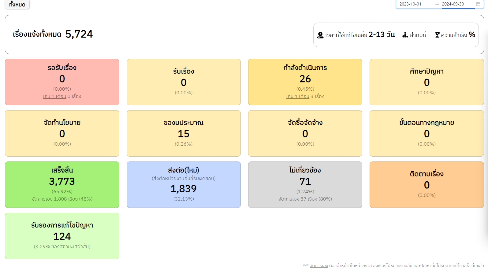 | 102 | ![]() | 2024-09-30 00:00:00.0000000 | 10.00 | 0.00 | - จำนวนเรื่องร้องเรียนทั้งหมด 5,724 เรื่อง - รอรับเรื่อง 0 เรื่อง - กำลังดำเนินการ 26 เรื่อง - ขั้นตอนทางกฎหมาย 0 เรื่อง - ส่งต่อ 1,839 เรื่อง - ไม่เกี่ยวข้อง 71 เรื่อง - เสร็จสิ้น 3,773 เรื่อง คิดเป็นร้อยละ 99.28 ของจำนวนเรื่องร้องเรียนทั้งหมด (รวมเรื่องส่งต่อและไม่เกี่ยวข้อง) (ข้อมูล 1 ตุลาคม 2566 – 30 กันยายน 2567) ปัญหา อุปสรรค : - รูปภาพ หรือคำอธิบายที่ประชาชนส่งเข้ามาไม่ชัดเจน ส่งผลให้เจ้าหน้าที่ไม่สามารถดำเนินการแก้ไขปัญหาได้ทันที - เจ้าหน้าที่รับเรื่องร้องเรียน (ฝ่ายปกครอง) ไม่ได้รับการฝึกอบรมเกี่ยวกับกฎหมายที่เกี่ยวข้องในการปฏิบัติงาน ทำให้ขาดความรู้ และไม่ทราบว่าเรื่องร้องเรียนประเภทต่าง ๆ อยู่ในความรับผิดชอบของฝ่ายใดหรือสำนักงานเขตสามารถดำเนินการได้หรือไม่ และเป็นเหตุให้เกิดความล่าช้าในการจัดการเรื่องร้องเรียน - ประชาชนไม่พอใจ ในกรณีที่ปัญหาไม่ได้รับการแก้ไขอย่างทันท่วงที และบางครั้งใช้ถ้อยคำหยาบคายในการแจ้งเรื่องร้องเรียน - เรื่องร้องเรียนที่ถูกส่งเข้ามาให้แต่ละเขต จะอ้างอิงตามพิกัดของผู้ส่ง ซึ่งบ่อยครั้งที่พิกัดไม่ตรงกับเรื่องที่แจ้ง หรือพิกัดกับเรื่องที่แจ้งอยู่นอกพื้นที่เขต ทำให้เสียเวลาในการตรวจสอบเพิ่มขึ้น - หน่วยงานอื่น ๆ ที่ไม่ได้อยู่ภายใต้การกำกับดูแลของกรุงเทพมหานคร ไม่กระตือรือร้นในการแก้ไขปัญหา และเข้าดำเนินการแก้ไขล่าช้า ทำให้ประชาชนแจ้งเรื่องร้องเรียนเดิมเข้ามาซ้ำ ๆ หลายครั้ง - ระบบแจ้งเรื่องร้องเรียนของ กทม. 1555 ที่แจ้งเข้ามาใน Traffy Fondue ไม่มีการแนบรูปเข้ามารวมถึงไม่สามารถสอบถามข้อมูลเพิ่มเติมไปยังผู้ร้องเรียนโดยตรงได้ กรณีที่พิกัดหรือสถานที่ที่แจ้งให้เข้าไปแก้ไขปัญหาไม่ชัดเจน ซึ่งทำให้ต้องใช้ระยะเวลาเพิ่มขึ้นในการจัดการปัญหา หลักฐานอ้างอิง : - https://citydata.traffy.in.th/new-stat | ||