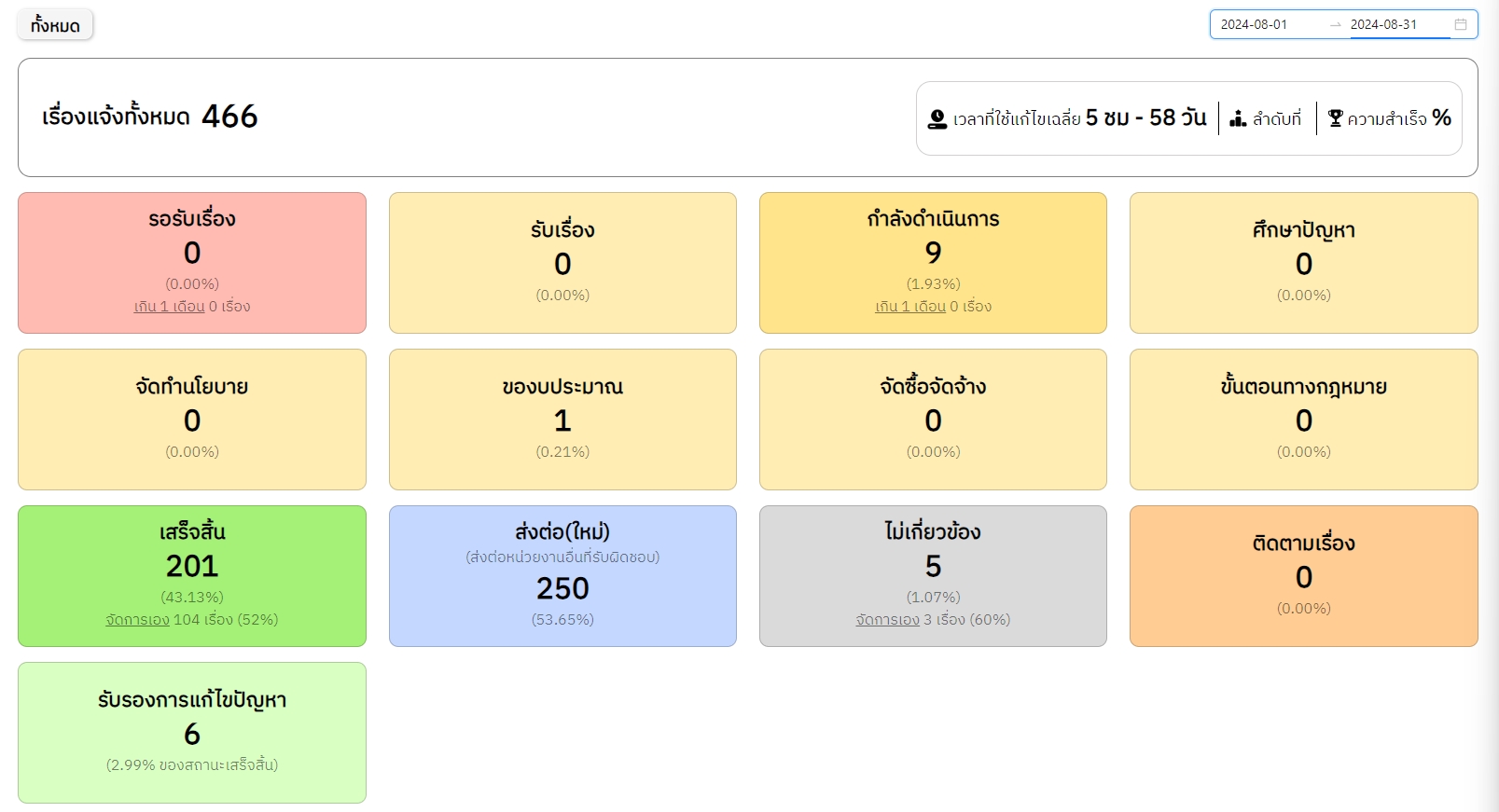 ![]() | 13 | ดำเนินการแก้ไขปัญหาข้อร้องเรียน ที่ได้รับจากแพลตฟอร์ม Traffy Fondue ประจำเดือนสิงหาคม | 5.00 | 2024-08-01 00:00:00.0000000 | 2024-08-31 00:00:00.0000000 |