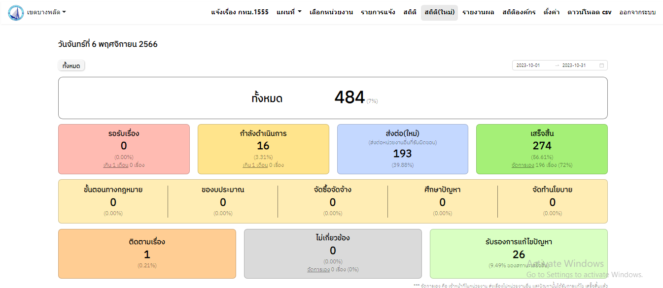 | 102 | ![]() | 2023-11-06 00:00:00.0000000 | 5.00 | 0.00 | สถิติการดำเนินการรับเรื่องร้องเรียนผ่าน Traffy Foundue เดือนตุลาคม 2566 ทั้งหมด 484 เรื่อง ดำเนินการเสร็จสิ้น 274 เรื่อง ส่งต่อ 193 เรื่อง กำลังดำเนินการ 16 เรื่อง และติดตามเรื่อง 1 เรื่อง คิดเป็นร้อยละ 96.49 |