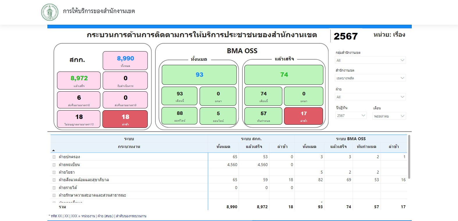 | 21 | ![]() | 2024-09-24 00:00:00.0000000 | 0.00 | 0.00 | สำนักงานเขตบางพลัด : จำนวนคำขอที่เขตให้บริการทั้งหมด ประจำเดือนกันยายน 2567 จำนวน 5,041 คำขอ / จำนวนคำขอที่สามารถให้บริการได้ภายในกรอบเวลาตามคู่มือประชาชน จำนวน 5,029 คำขอ ฝ่ายปกครอง : ผู้มารับบริการประจำเดือนกันยายน 2567 จำนวน 68 ราย สามารถให้บริการภายในกรอบระยะเวลาที่กำหนดตามคู่มือประชาชน | ||