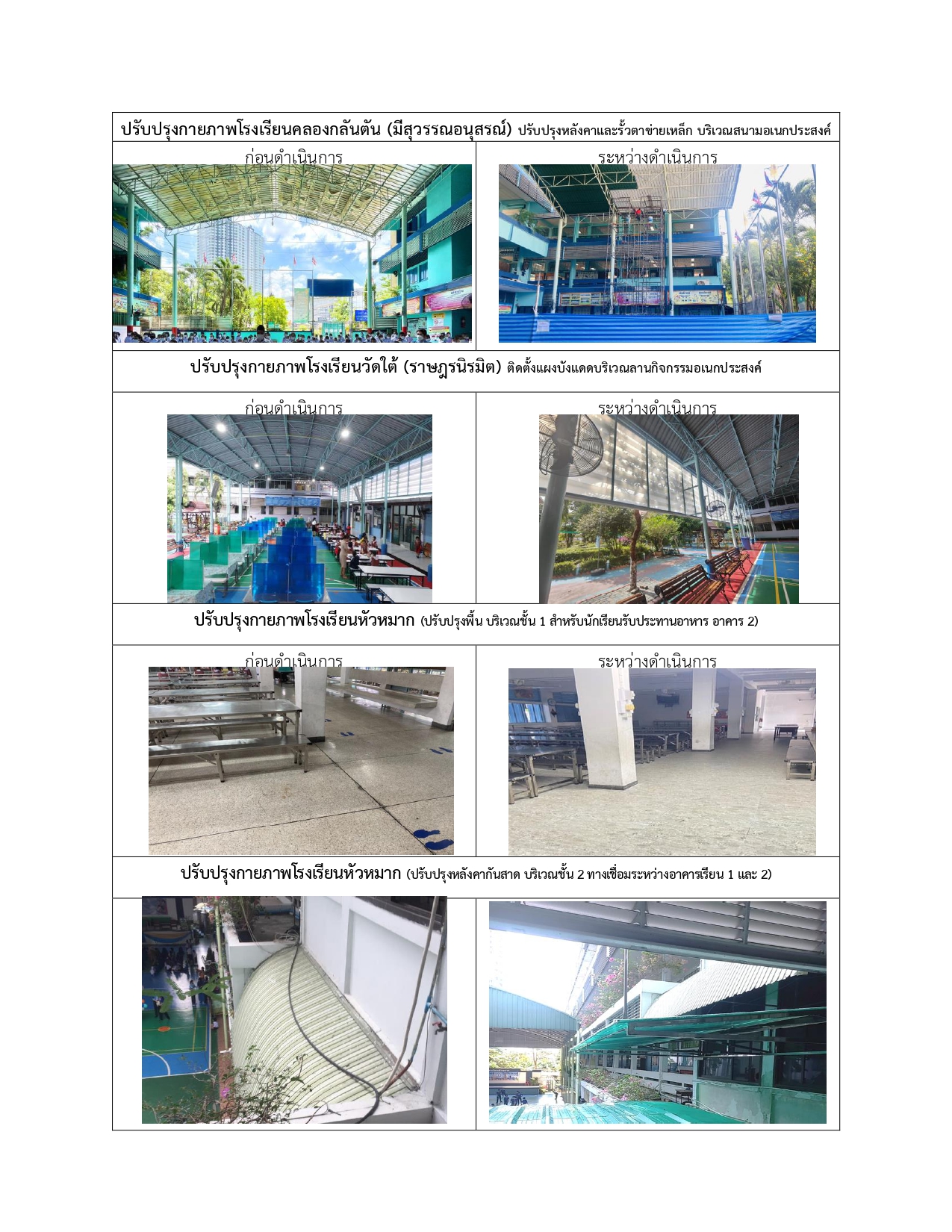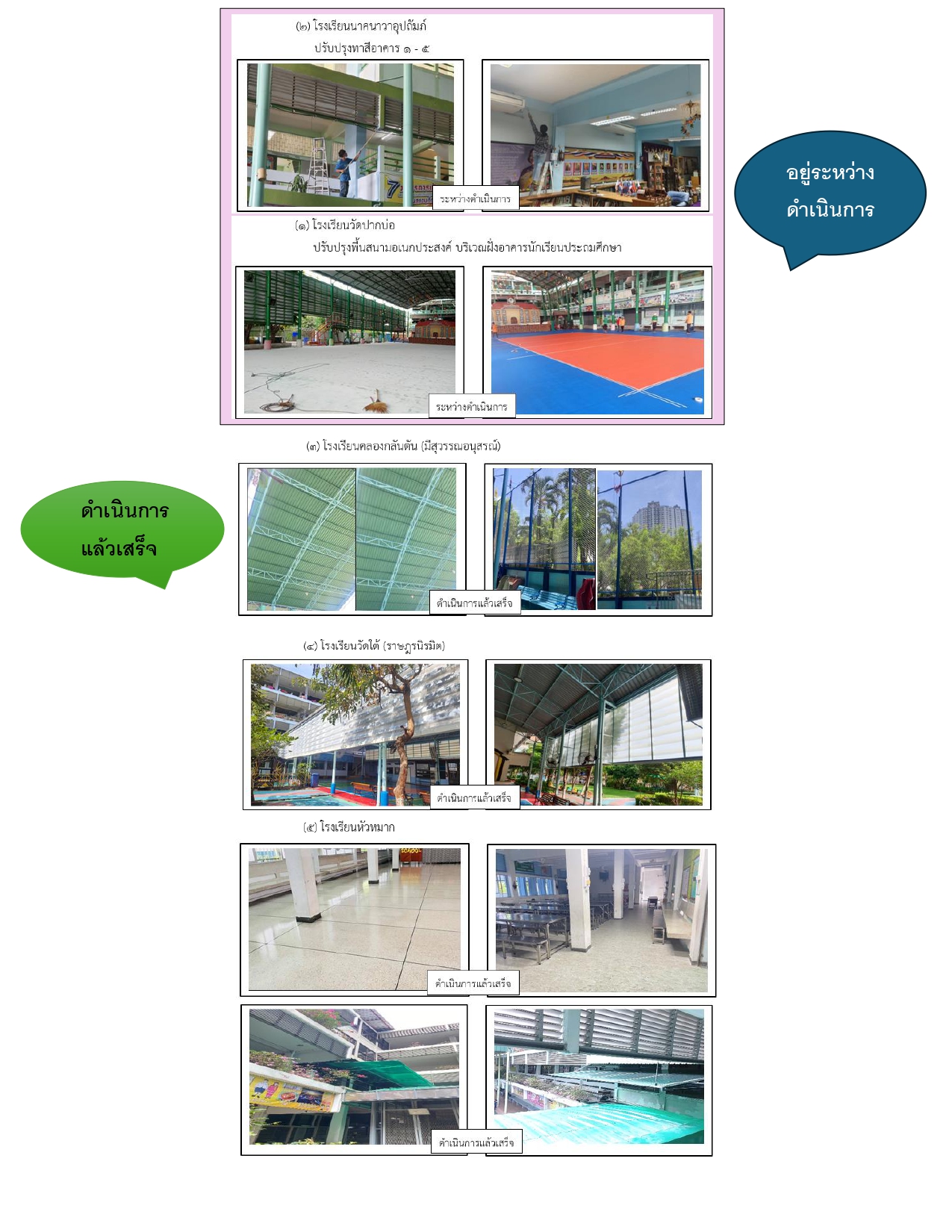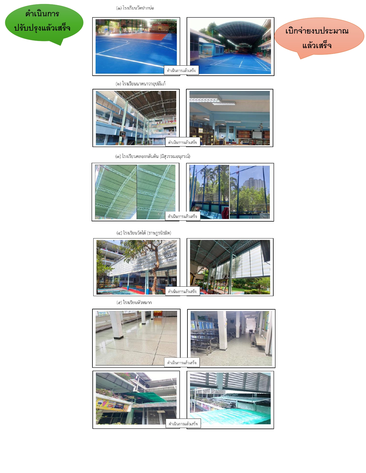 | 16 | ![]() | 2024-07-31 00:00:00.0000000 | 0.00 | 0.00 | ดำเนินการปรับปรุงกายภาพโรงเรียนแล้วเสร็จ ดังนี้ 1. โรงเรียนคลองกลันตัน (มีสุวรรณอนุสรณ์) ปรับปรุงหลังคาและรั้วตาข่ายเหล็ก บริเวณสนามอเนกประสงค์ 2. โรงเรียนวัดใต้ (ราษฎรนิรมิต) ติดตั้งแผงบังแดด บริเวณลานกิจกรรมอเนกประสงค์ 3. โรงเรียนหัวหมาก ปรับปรุง (1) ปรับปรุงพื้น บริเวณชั้น 1 สำหรับนักเรียนรับประทานอาหาร อาคาร 2 (2) ปรับปรุงหลังคากันสาด บริเวณชั้น 2 ทางเชื่อมระหว่างอาคารเรียน 1 และ 2 4. โรงเรียนนาคนาวาอุปถัมภ์ ปรับปรุงทาสีอาคาร 1 - 5 5. โรงเรียนวัดปากบ่อ ปรับปรุงพื้นสนามอเนกประสงค์ บริเวณฝั่งอาคารนักเรียนประถมศึกษา | ||