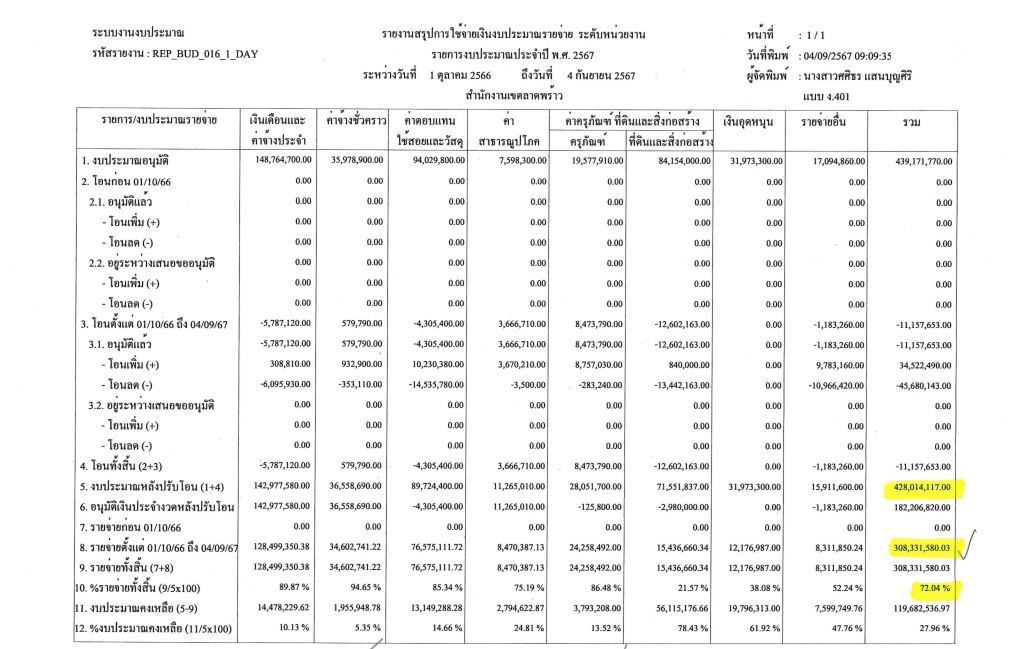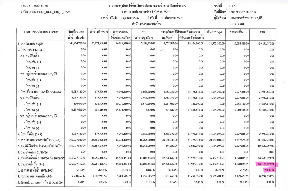 | 1415 |  | 2024-09-30 00:00:00.0000000 | 18.05 | 0.00 |  | การเบิกจ่ายงบประมาณ ตั้งแต่วันที่ 1 ตุลาคม 2566-30 กันยายน 2567 เป็นเงิน 370,493,359.71 บาท คิดเป็น 90.09% | |