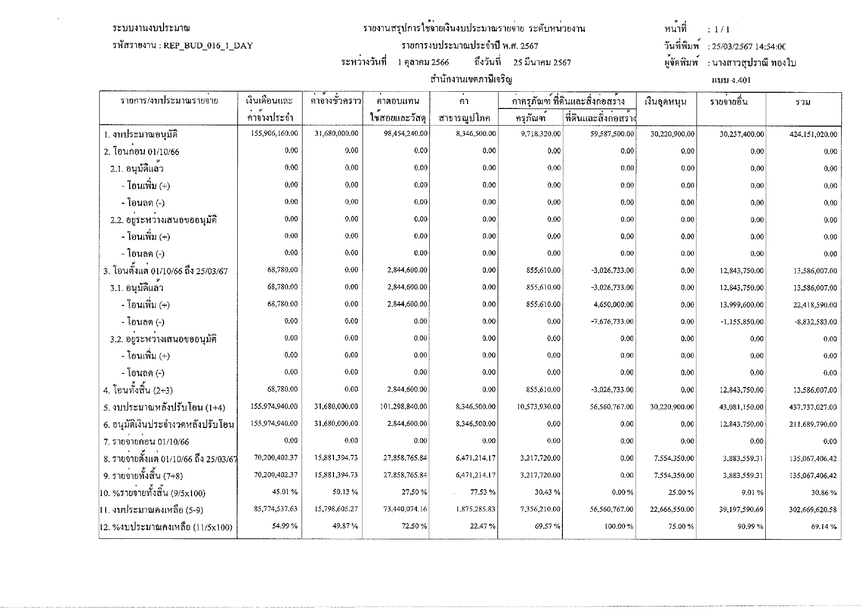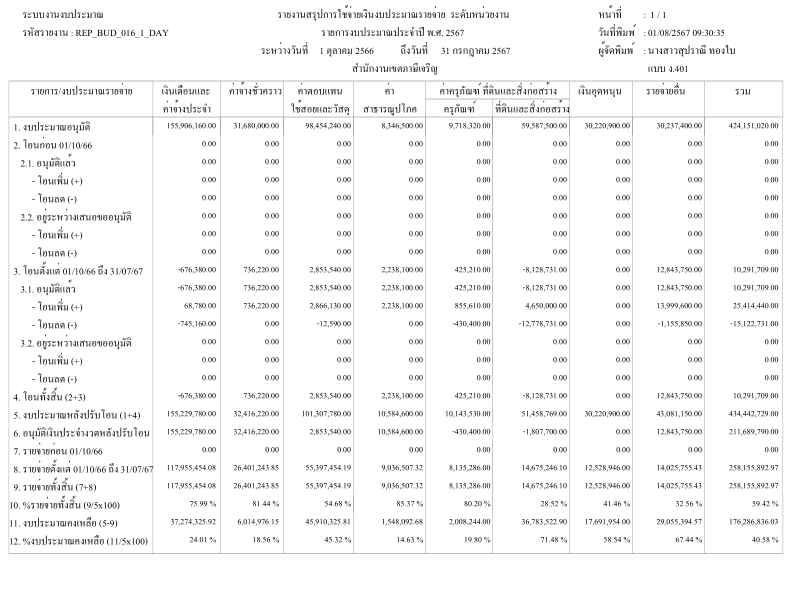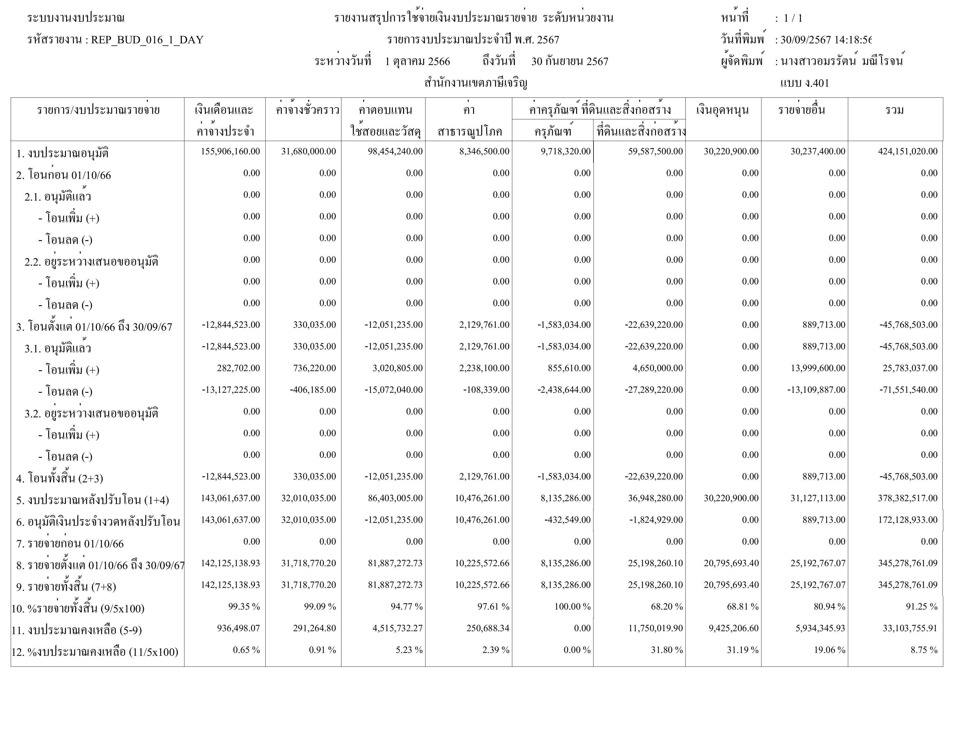 | 1413 |  | 2024-09-30 00:00:00.0000000 | 91.25 | 0.00 |  | ผลการเบิกจ่ายงบประมาณในภาพรวมของสำนักงานเขตภาษีเจริญ ณ วันที่ 30กันยายน 2567 ได้ร้อยละ 91.25 | |