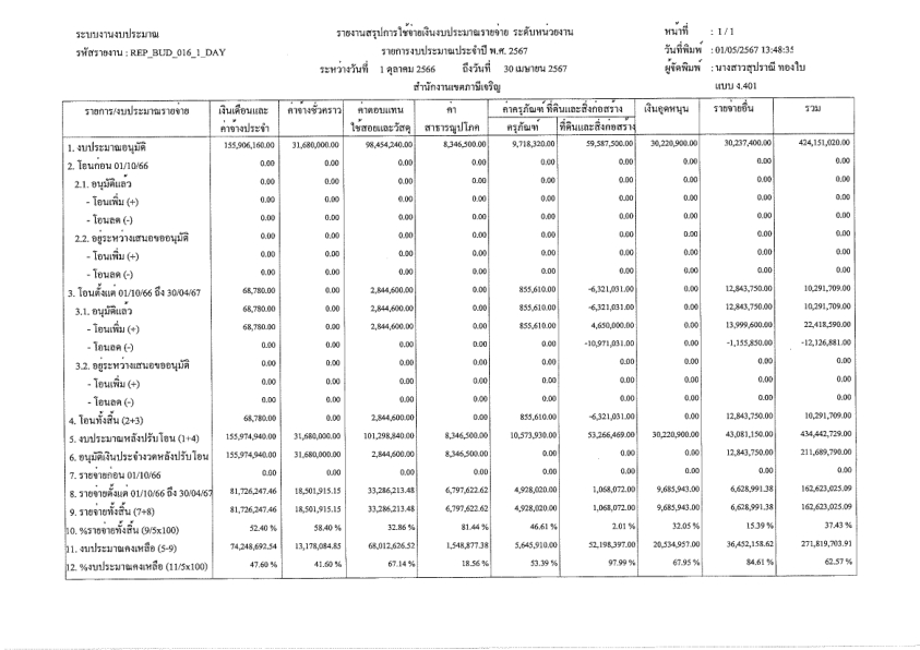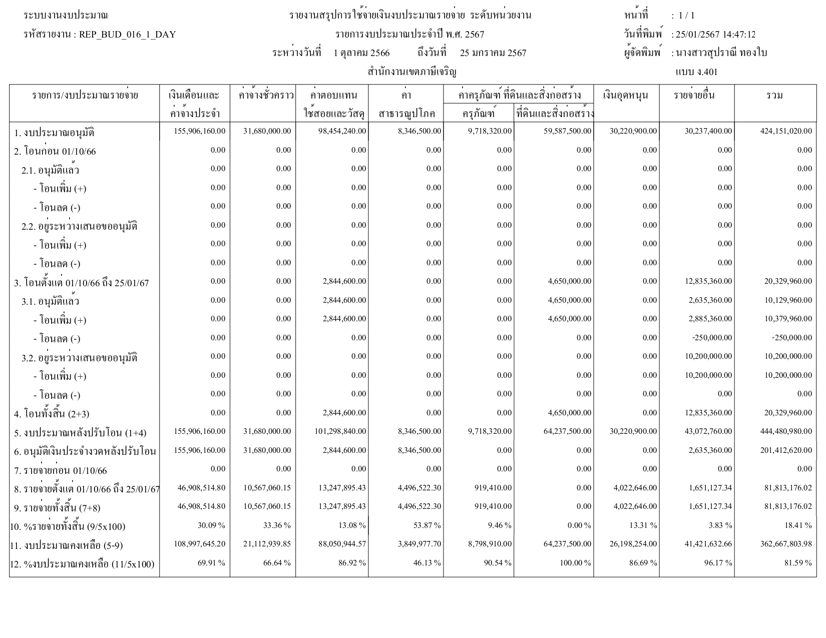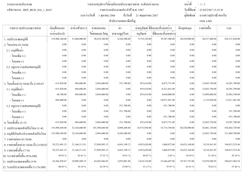 | 1413 |  | 2024-05-01 00:00:00.0000000 | 37.43 | 0.00 |  | ผลการเบิกจ่ายงบประมาณในภาพรวมของสำนักงานเขตภาษีเจริญ ณ วันที่ 30 เมษายน 2567 ได้ร้อยละ 37.43 | |