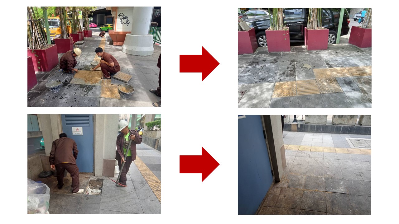 | 1 | ![]() | 2024-01-31 00:00:00.0000000 | 1.85 | 0.00 | 1. จัดเก็บสายไฟ/ 2. ปรับทางเดินจุดที่มีความเสี่ยง (เหล็กโผล่จากพื้น)/ 3. ล้างทำความสะอาด/ 4. เจ้าหน้าที่เทศกิจตรวจตรา และกวดขันความเป็นระเบียบเรียบร้อย | ||