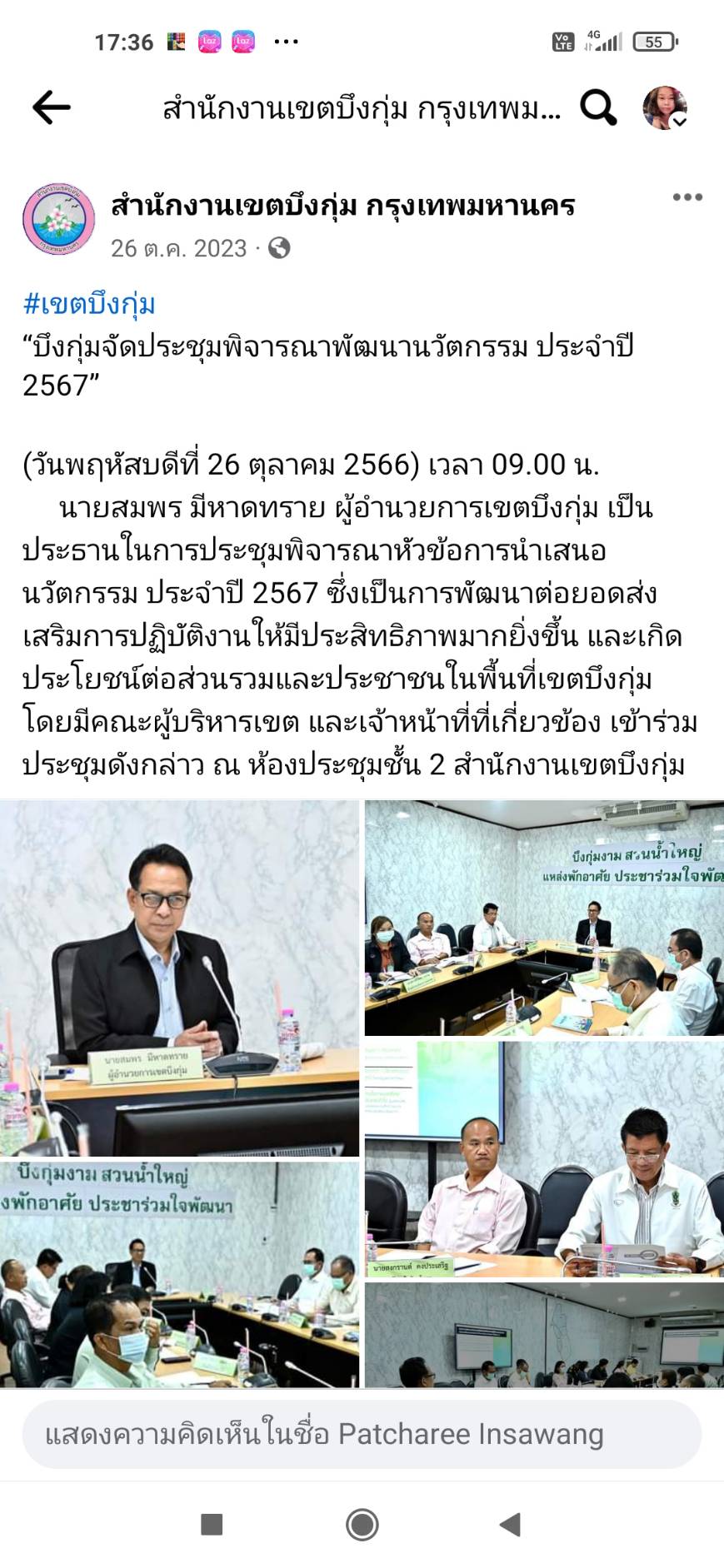 14132024-04-01 00:00:00.000000030.000.00คณะกรรมการพัฒนานวัตกรรมกรุงเทพมหานคร แจ้งผลการพิจารณาแนวคิดในการพัฒนานวัตกรรมเพื่อเพิ่มประสิทธิภาพการปฏิบัติงานของหน่วยงาน ประจำปีงบประมาณ พ.ศ. 2567 ในการประชุมครั้งที่ 10/2567 เมื่อวันที่ 13 กุมภาพันธ์ 2567 ให้สำนักงานเขตบึงกุ่ม ดำเนินการโครงการระบบแจ้งเหตุฝาท่อชำรุด เป็นโครงการนวัตกรรม ประจำปี 2567