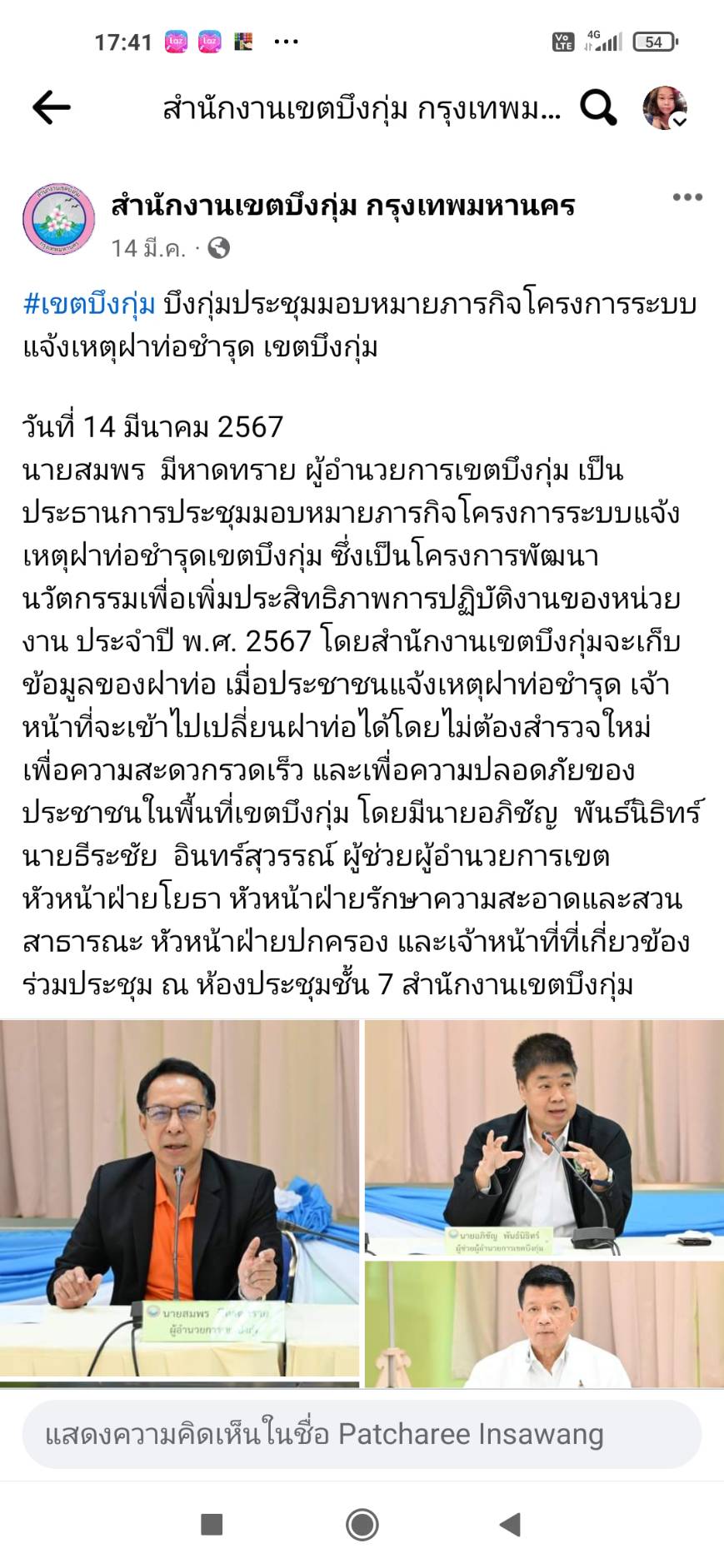 14132024-04-01 00:00:00.000000020.000.00สำนักงานเขตบึงกุ่ม ดำเนินการพัฒนานวัตกรรม โดยจัดทำระบบแจ้งเหตุฝาท่อชำรุด เขตบึงกุ่ม แล้วเสร็จ และดำเนินการมอบหมายภารกิจให้ฝ่ายที่รับผิดชอบ ดำเนินการเก็บข้อมูลฝาท่อ ในพื้นที่เขตบึงกุ่ม
