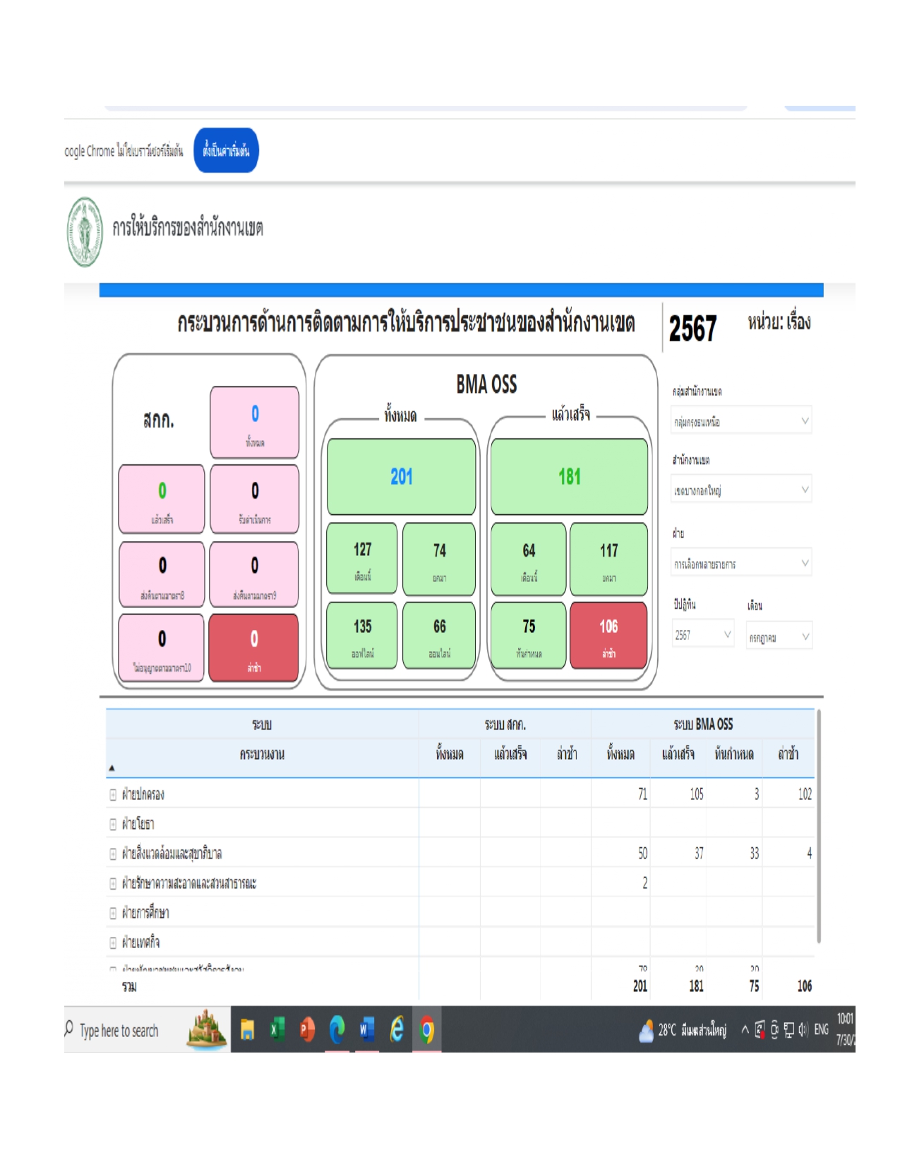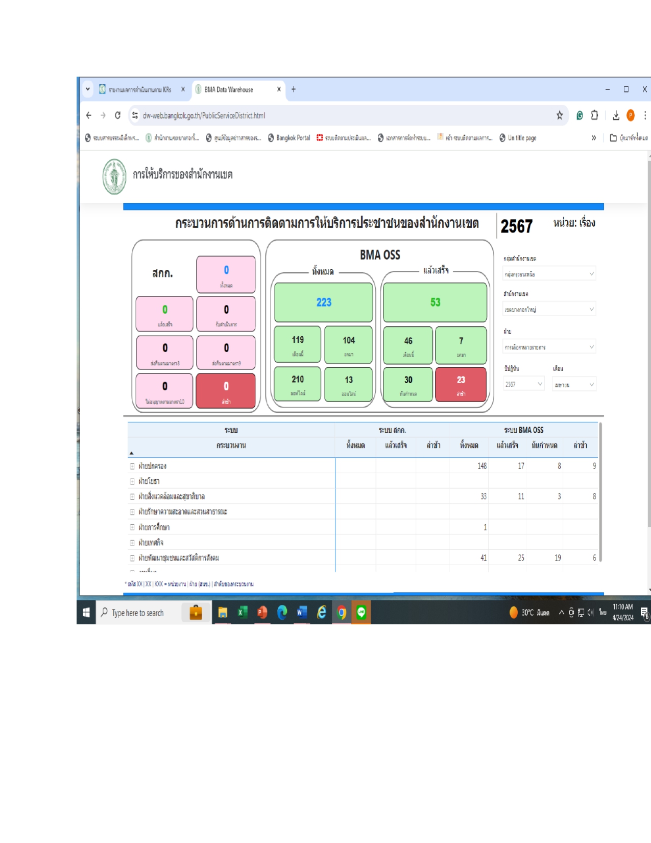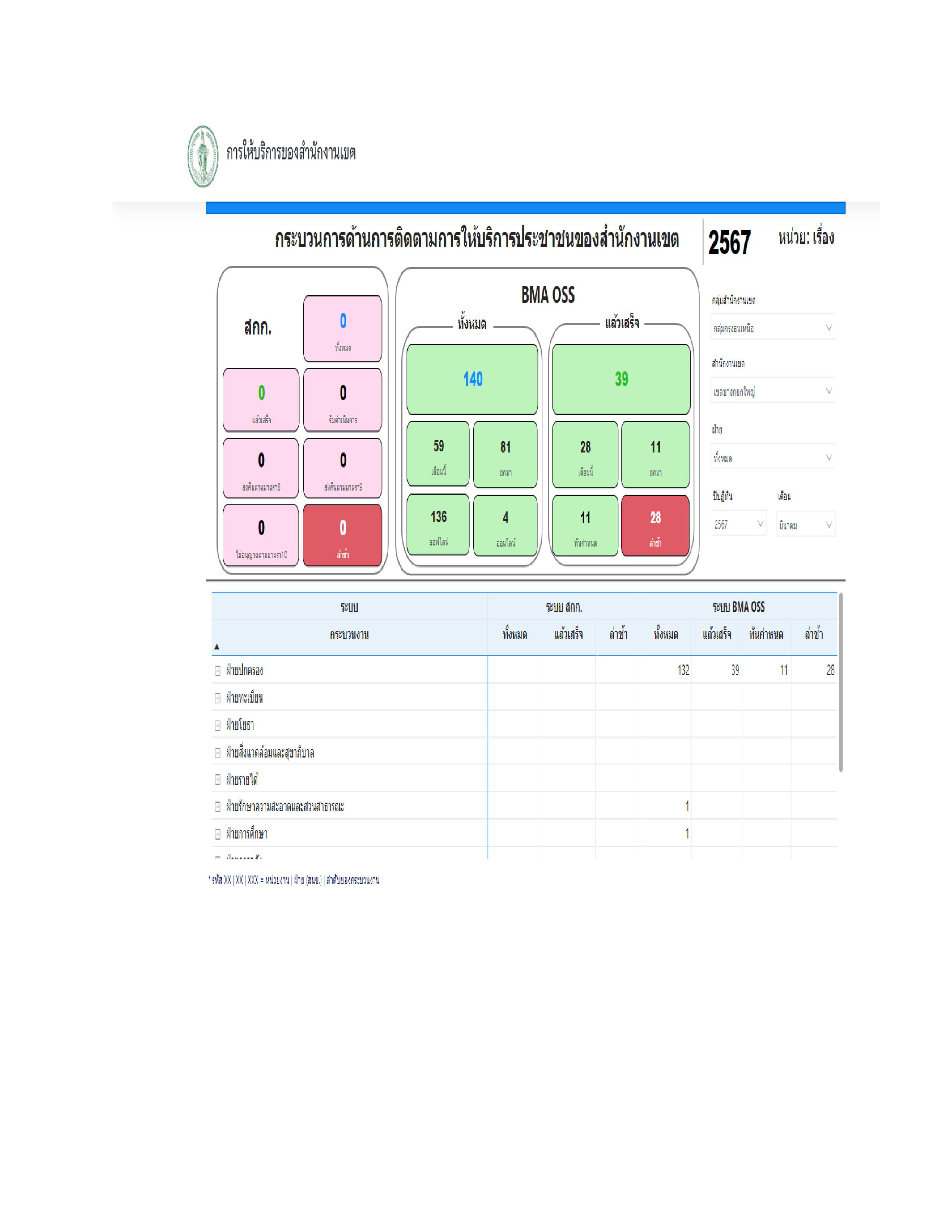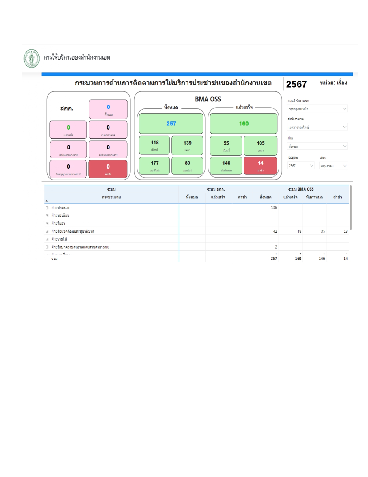 | 1414 | ![]() | 2024-05-27 00:00:00.0000000 | 100.00 | 0.00 | ข้อมูล BMA OSS ถึงเดือนพ.ค. 67 จำนวน 257 คำขอ ข้อมูลเดือนพ.ค. 118 คำขอ ยอดยกมา 139 คำขอ แบ่งเป็นข้อมูลระบบออฟไลน์ 177 คำขอ ข้อมูลระบบออนไลน์ 80 คำขอ ข้อมูล BMA OSS แล้วเสร็จถึงเดือนพ.ค. 67 จำนวน 160 คำขอ เดือนพ.ค. 67 จำนวน 55 คำขอ ยกมา 105 คำขอ ทันกำหนด 146 คำขอ ล่าช้า 14 คำขอ | ||