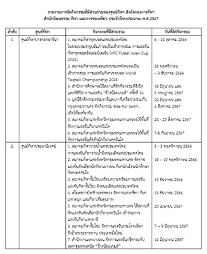 6512024-09-27 00:00:00.00000002.000.00มีศูนย์กีฬาที่ดำเนินการจัดกิจกรรมที่มีส่วนร่วม จำนวน 2 ศูนย์กีฬา ได้แก่ ศูนย์กีฬาบางกอกอารีน่า จำนวน 6 ครั้ง และศูนย์กีฬาประชานิเวศน์ จำนวน 7 ครั้ง (ตามไฟล์แนบ)