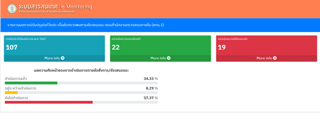14132024-08-26 00:00:00.00000004.000.00- ผู้ตรวจสอบภายในรบันทึกข้อมูลขัอสั่งการฯ ในระบบแล้วเสร็จ จำนวน 40 ภารกิจ (จาก 107 ภารกิจ) และอยู่ระหว่างติดตามให้หน่วยรับตรวจรายงานผลความคืบหน้าาผ่านระบบฯ - ผลประเมินความพึงพอใจของกลุ่มผู้มีส่วนได้ส่วนเสียที่เกี่ยวข้อง ค่าคะแนนเฉลี่ยนความพึงพอใจในระดับมากขึ้นไป คิดเป็นร้อยละ 94.23