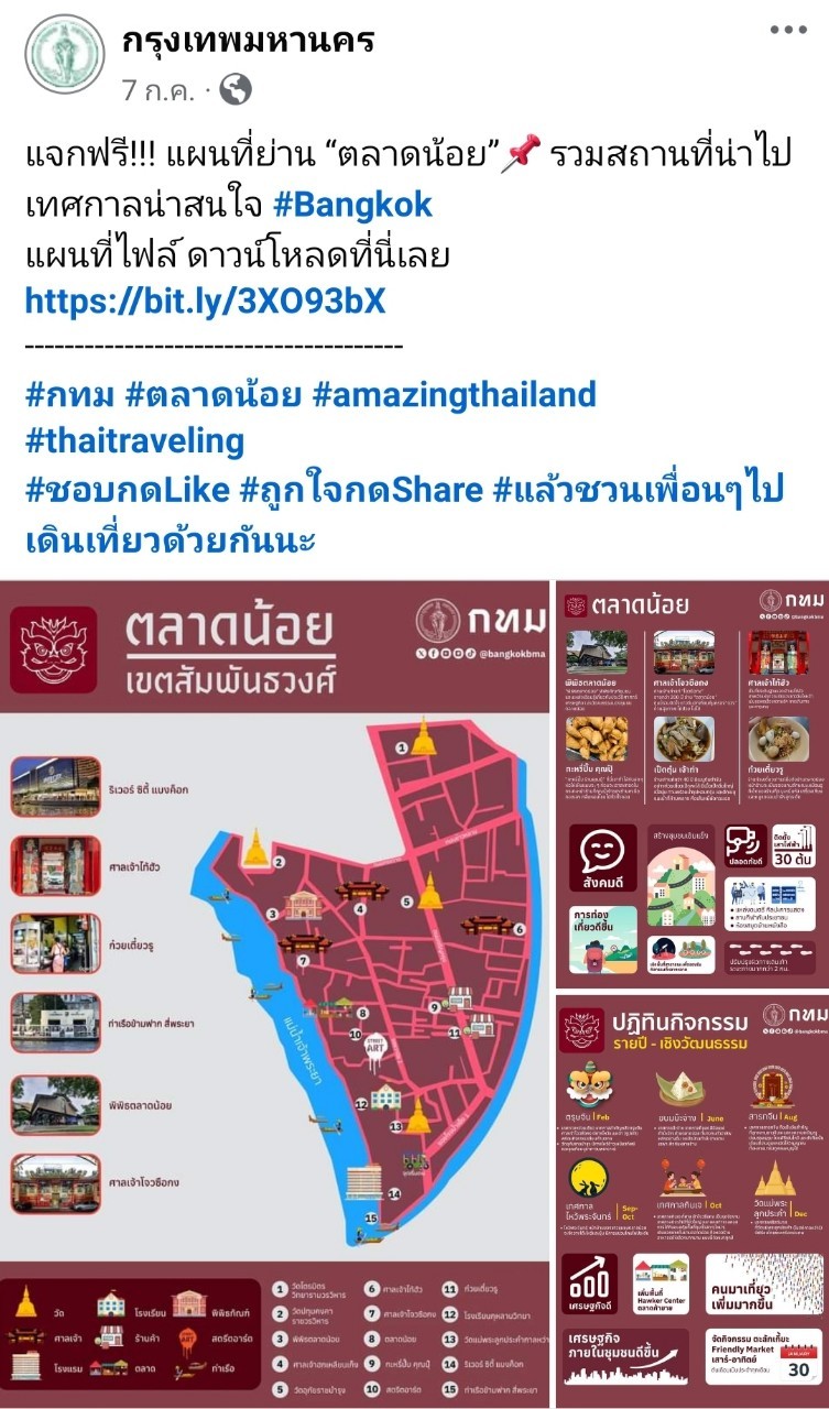 พ.ศ. 2567 เมื่อวันพุธที่ 24 มกราคม 2567 เวลา 10.00 – 12.00 น. ณ ห้องประชุม ชั้น 16 อาคารธานี-นพรัตน์ ศาลาว่าการกรุงเทพมหานคร 2 (ดินแดง) และจัดกิจกรรมการสร้างกระบวนการมีส่วนร่วมฯ พร้อมกับสำรวจพื้นที่ย่าน 6 ย่าน ดังนี้ 1. ย่านชุมชนพูนบำเพ็ญ เขตภาษีเจริญ เมื่อวันพุธที่ 14 กุมภาพันธ์ 2567 ณ ตลาดชุมชนพูนบำเพ็ญ เขตภาษีเจริญ 2. ย่านคลองลำไทร เขตหนองจอก เมื่อวันศุกร์ที่ 16 กุมภาพันธ์ 2567 ณ ศูนย์การเรียนรู้บ้านครูแดง เขตหนองจอก 3. ย่านตลาดน้อย เขตสัมพันธวงศ์ เมื่อวันจันทร์ที่ 19 กุมภาพันธ์ 2567 ณ ห้องประชุมทรงวาด ชั้น 5 อาคาร 1 เขตสัมพันธวงศ์ 4. ย่านตลาดพลู เขตธนบุรี เมื่อวันพฤหัสบดีที่ 29 กุมภาพันธ์ 2567 ณ ห้องประชุมโรงเรียนวัดราชคฤห์ เขตธนบุรี 5. ย่านเจริญกรุง 103 เขตบางคอแหลม เมื่อวันเสาร์ที่ 2 มีนาคม 2567 ณ ที่ทำการชุมชนสวนหลวง 1 ซอยเจริญกรุง 103 เขตบางคอแหลม 6. ย่านคลองบางมด เขตทุ่งครุ เมื่อวันพุธที่ 6 มีนาคม 2567 ณ มัสยิดนูรุ้ลฮูดา ย่านคลองบางมด เขตทุ่งครุ โดยสำนักวัฒนธรรม กีฬา และการท่องเที่ยว เข้าไปสนับสนุนการพัฒนาแหล่งท่องเที่ยวในด้านการสนับสนุนกระบวนการมีส่วนร่วมระหว่างหน่วยงานภาครัฐ เอกชน หน่วยงาน องค์กร และประชาชนในแหล่งท่องเที่ยว และร่วมกันสำรวจ รวบรวม วิเคราะห์ และสังเคราะห์ข้อมูล ดังนี้ 1. ย่านชุมชนพูนบำเพ็ญ เขตภาษีเจริญ