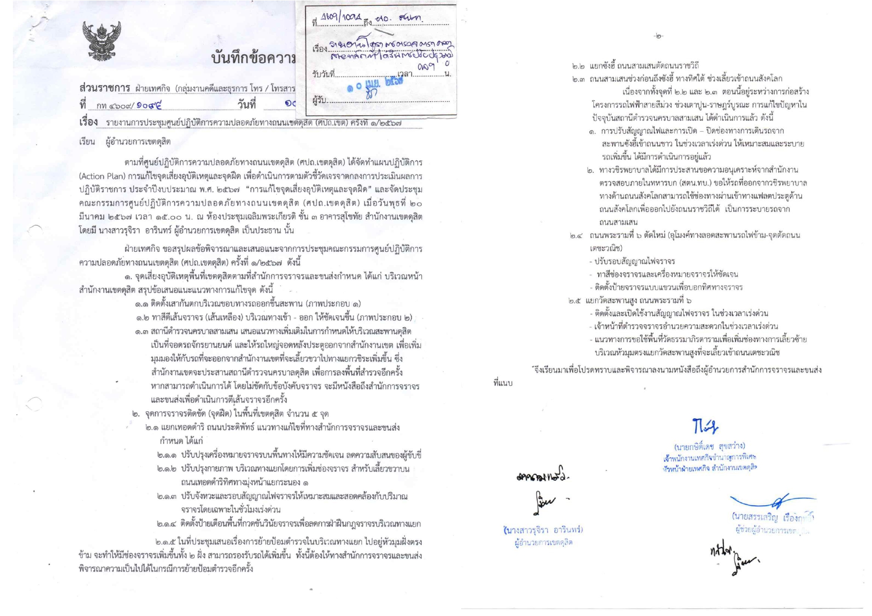 | 10 | ![]() | 2024-07-11 00:00:00.0000000 | 1.00 | 0.00 | ส่งรายงานการประชุมไปยังสำนักการจราจรและขนส่งไปเมื่อวันที่ 10 เมษายน 2567 เพื่อดำเนินการตามมติที่ประชุมเมื่อวันที่ 20 มีนาคม 2567 | ||