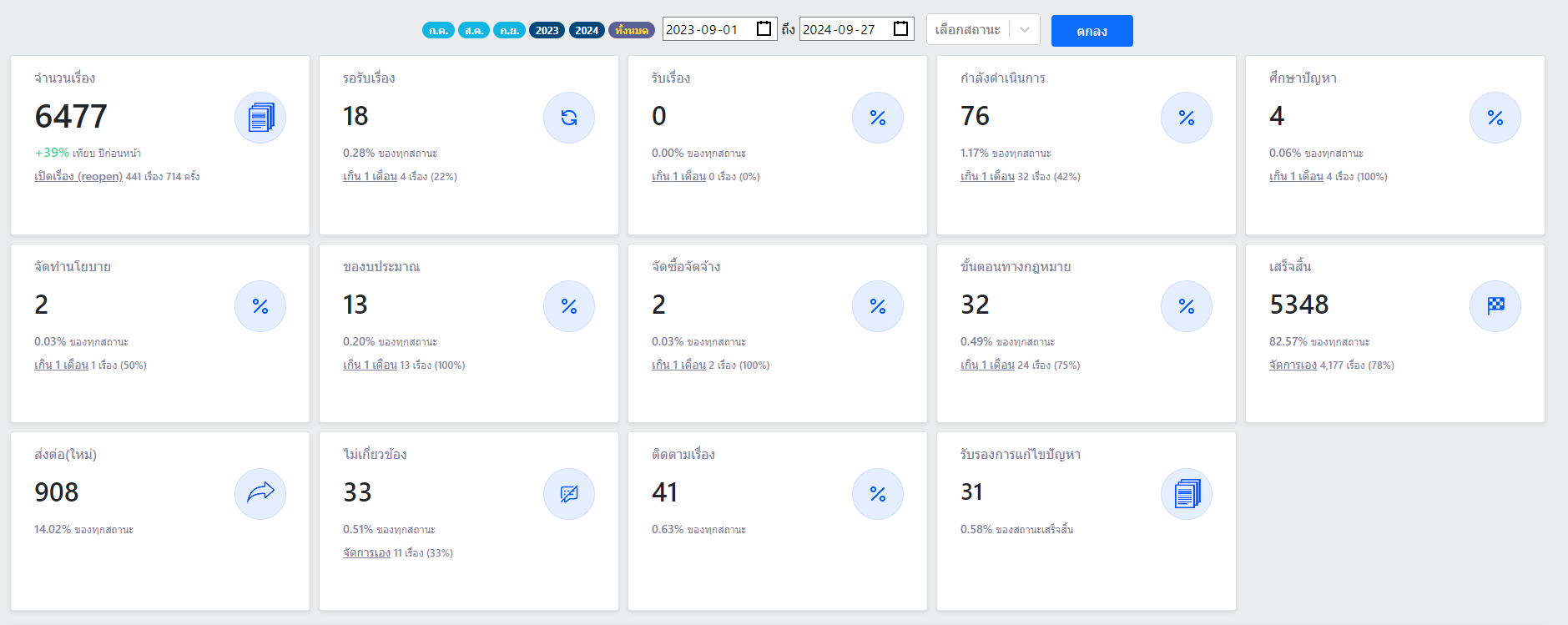 | 102 | ![]() | 2024-08-31 00:00:00.0000000 | 79.00 | 0.00 | ผลการดำเนินการแก้ไขเรื่องเรียนผ่านระบบ Traffy Fondue ระหว่างวันที่ 1 ต.ค. 66 - 30 ส.ค. 67 มีรายละเอียดดังนี้ จำนวนเรื่องทั้งหมด 5515 / รอรับเรื่อง 7 (0.13%) / รับเรื่อง 7 (0.13%) / กำลังดำเนินการ 166 (3.01%) / ศึกษาปัญหา 3 (0.05%) / จัดทำนโยบาย 1 (0.02%) / ของบประมาณ 12 (0.22%) / จัดซื้อจัดจ้าง 10 (0.18%) / ขั้นตอนทางกฎหมาย 18 (0.33%) / เสร็จสิ้น 4404 (79.85%) - จัดการเอง 3,477 (79%) / ส่งต่อใหม่ 822 (14.90%) / ไม่เกี่ยวข้อง 30 (0.54%) / ติดตามเรื่อง 42 (0.46%) / รับรองการแก้ไขปัญหา 29 (0.66%) | ||
