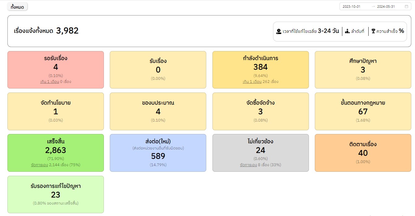 | 102 | ![]() | 2024-05-31 00:00:00.0000000 | 75.00 | 0.00 | ผลการดำเนินการแก้ไขเรื่องเรียนผ่านระบบ Traffy Fondue ระหว่างวันที่ 1 ต.ค. 66 - 31 พ.ค. 67 มีรายละเอียดดังนี้ รอรับเรื่อง 4 (0.10%) / รับเรื่อง 0 (0%) / กำลังดำเนินการ 384 (9.64%) / ศึกษาปัญหา 3 (0.08%) / จัดทำนโยบาย 1 (0.03%) / ของบประมาณ 4 (0.10%) จัดซื้อจัดจ้าง 3 (0.08%) / ขั้นตอนทางกฎหมาย 67 (1.68%) / เสร็จสิ้น 2,863 (71.90%) - จัดการเอง 2,144 (75%) / ส่งต่อใหม่ 589 (14.79%) / ไม่เกี่ยวข้อง 24 (0.60%) / ติดตามเรื่อง 40 (1.92%) / รับรองการแก้ไขปัญหา 23 (0.80%) | ||