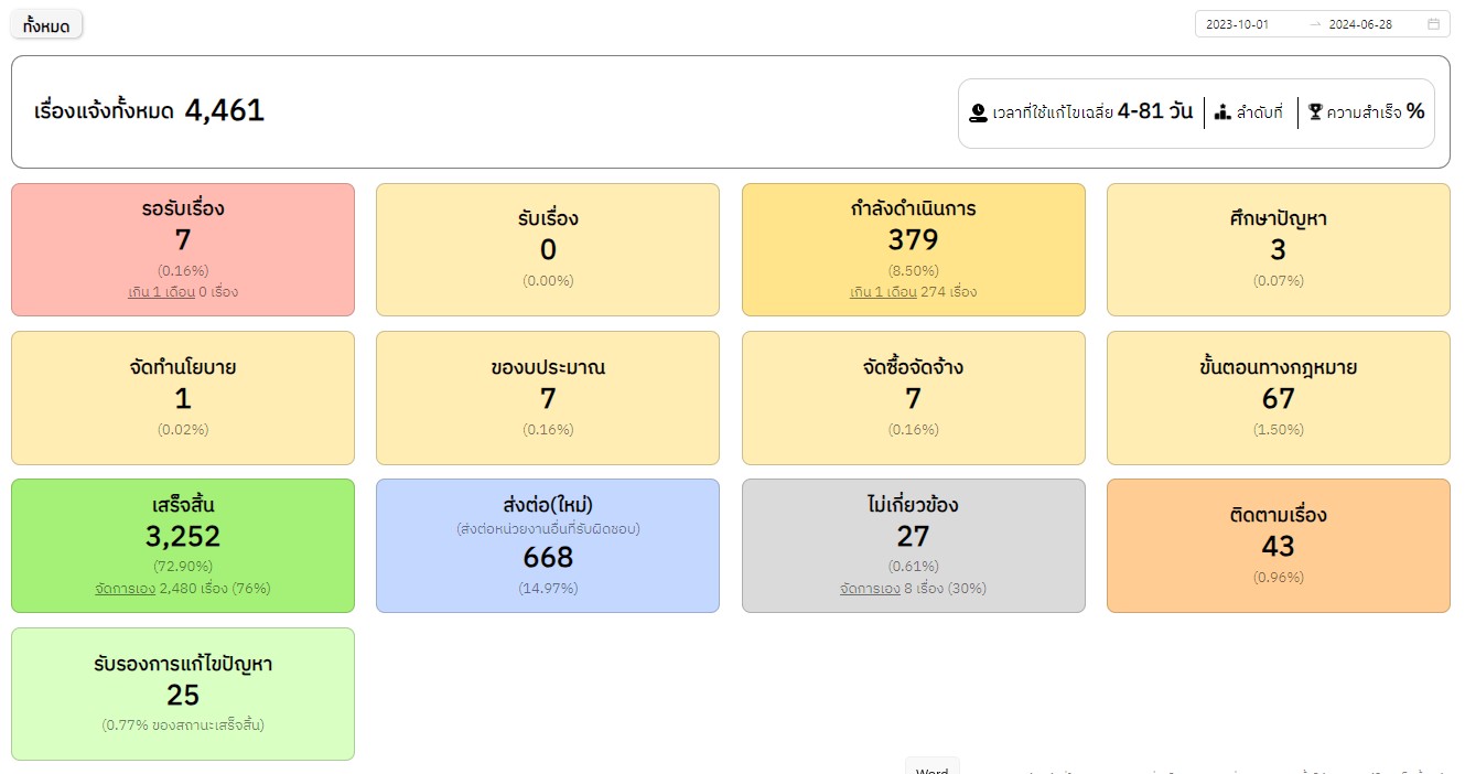 | 102 | ![]() | 2024-06-28 00:00:00.0000000 | 76.00 | 0.00 | ผลการดำเนินการแก้ไขเรื่องเรียนผ่านระบบ Traffy Fondue ระหว่างวันที่ 1 ต.ค. 66 - 28 มิ.ย. 67 มีรายละเอียดดังนี้ รอรับเรื่อง 7 (0.16%) / รับเรื่อง 0 (0%) / กำลังดำเนินการ 379 (8.50%) / ศึกษาปัญหา 3 (0.07%) / จัดทำนโยบาย 1 (0.02%) / ของบประมาณ 7 (0.16%) / จัดซื้อจัดจ้าง 7 (0.16%) / ขั้นตอนทางกฎหมาย 67 (1.50%) / เสร็จสิ้น 3,252 (72.90%) - จัดการเอง 2,480 (76%) / ส่งต่อใหม่ 668 (14.97%) / ไม่เกี่ยวข้อง 27 (0.61%) / ติดตามเรื่อง 43 (0.96%) / รับรองการแก้ไขปัญหา 25 (0.77%) | ||